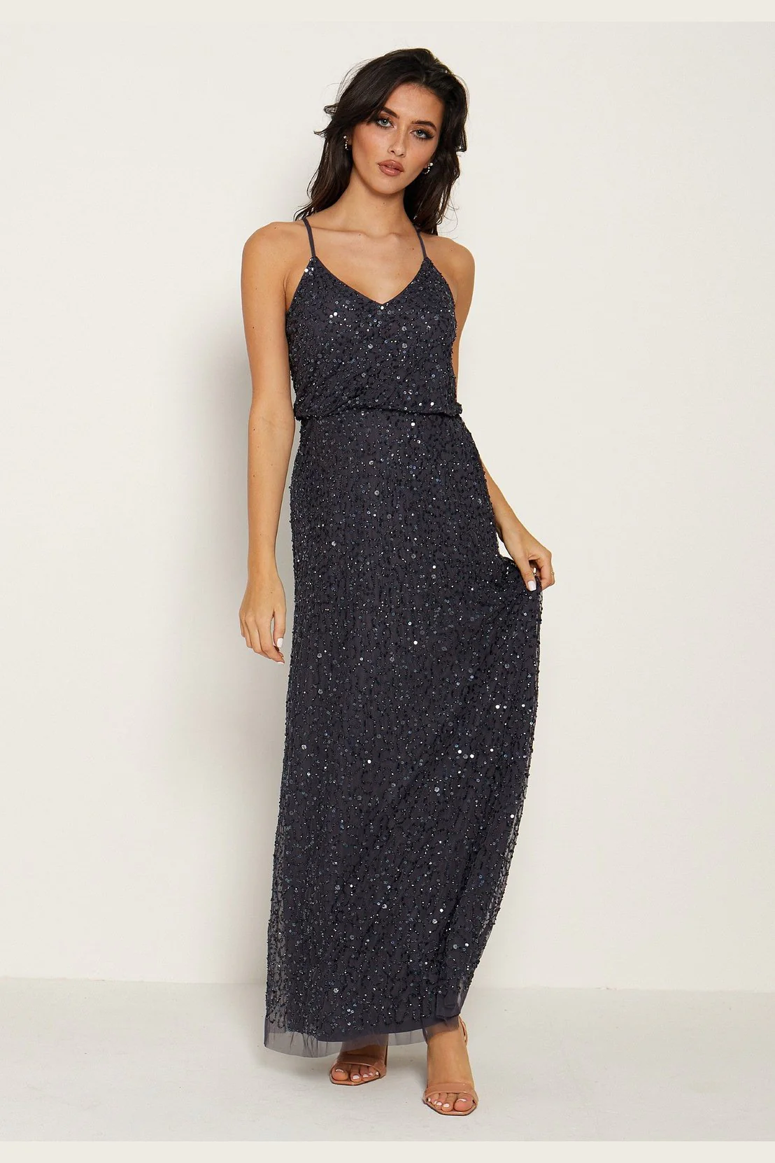 A grey embellished maxi dress with cami straps and a low open back. This dress zips up at the back under the opening. The straps cross over for a glamorous look.