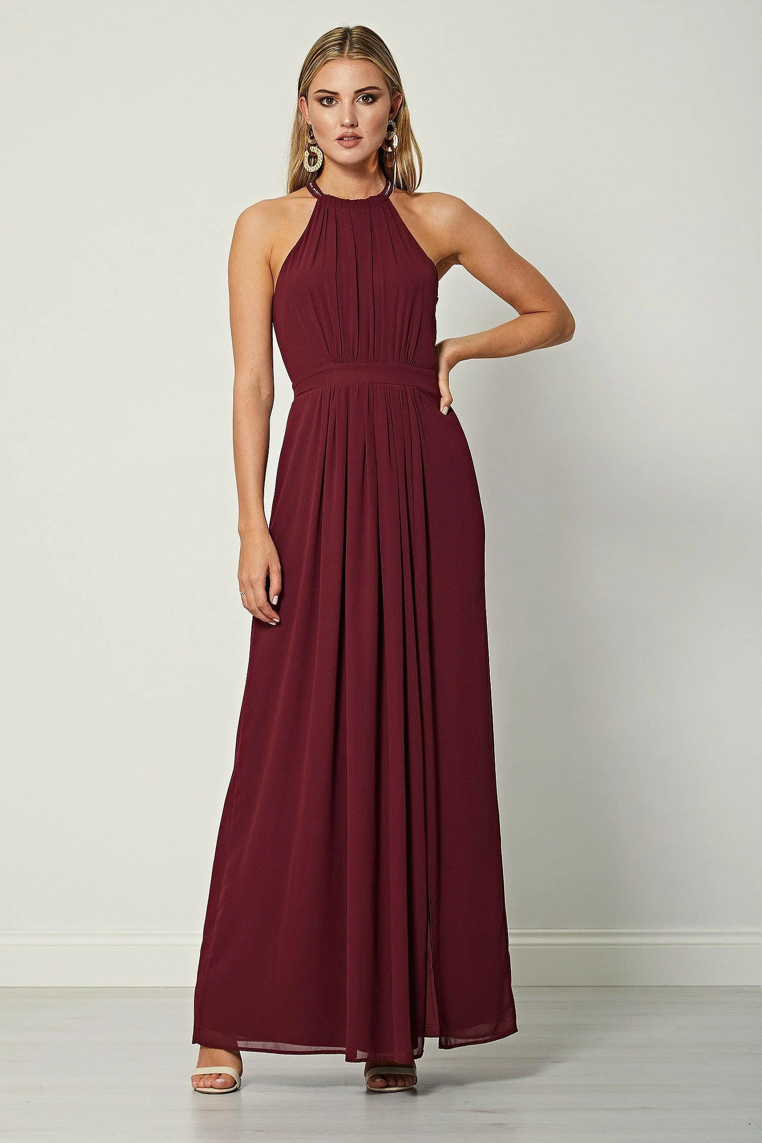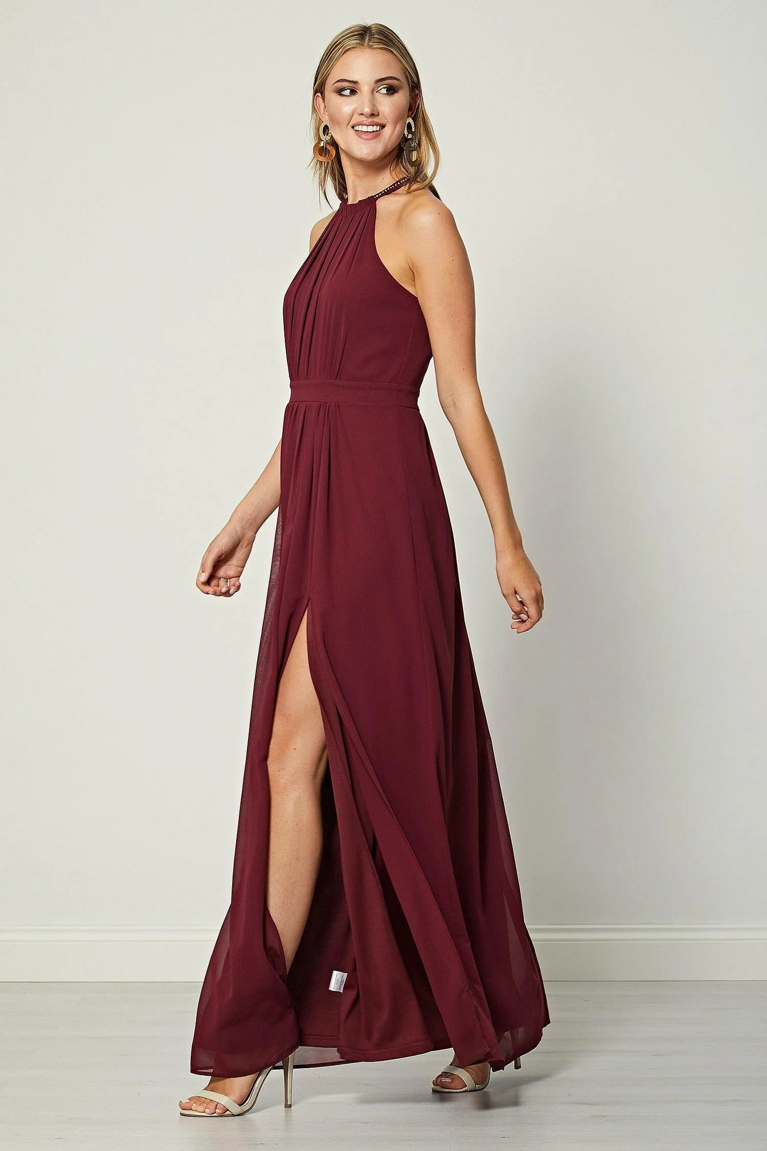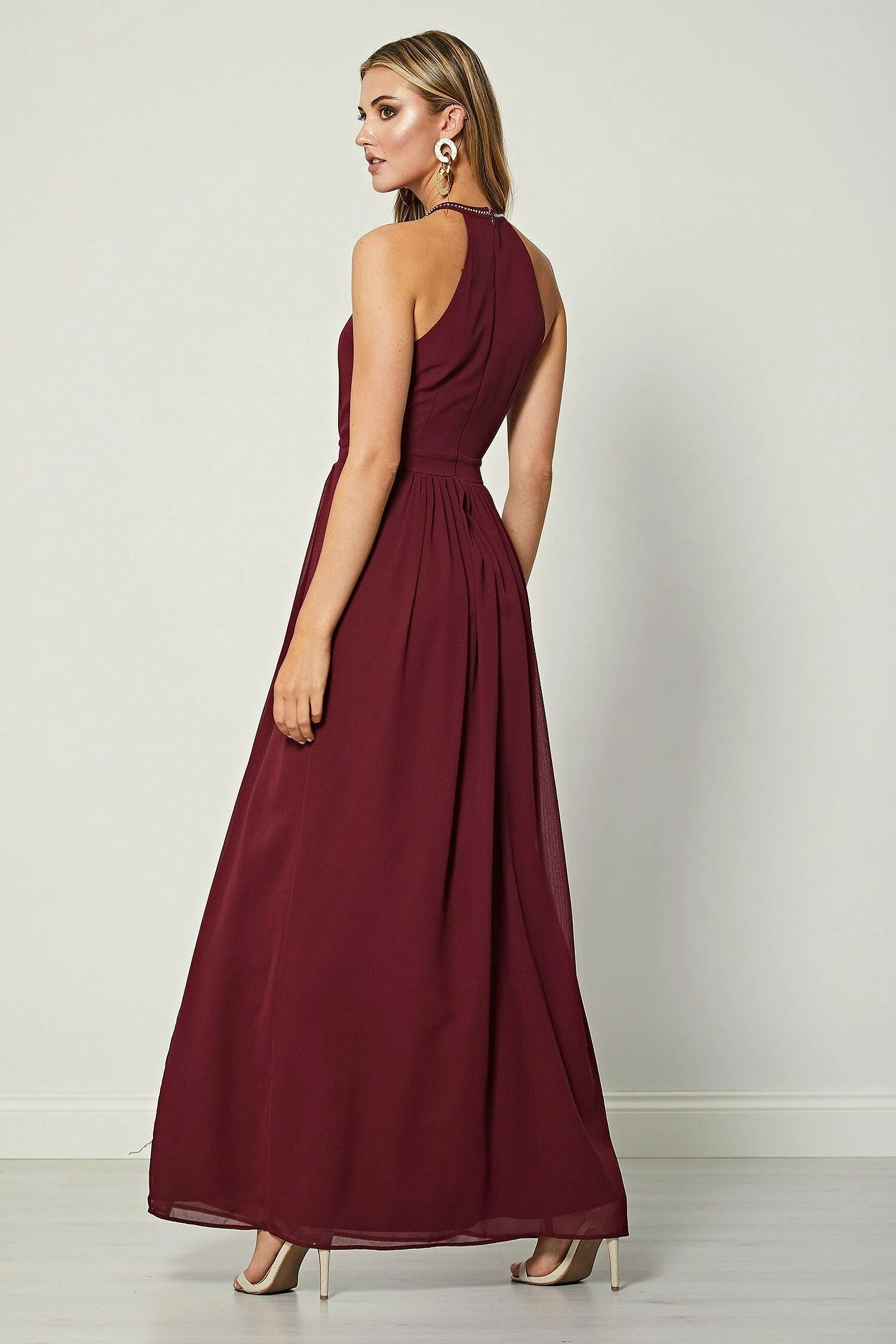 Angelina Burgundy Beaded Halterneck Maxi Dress