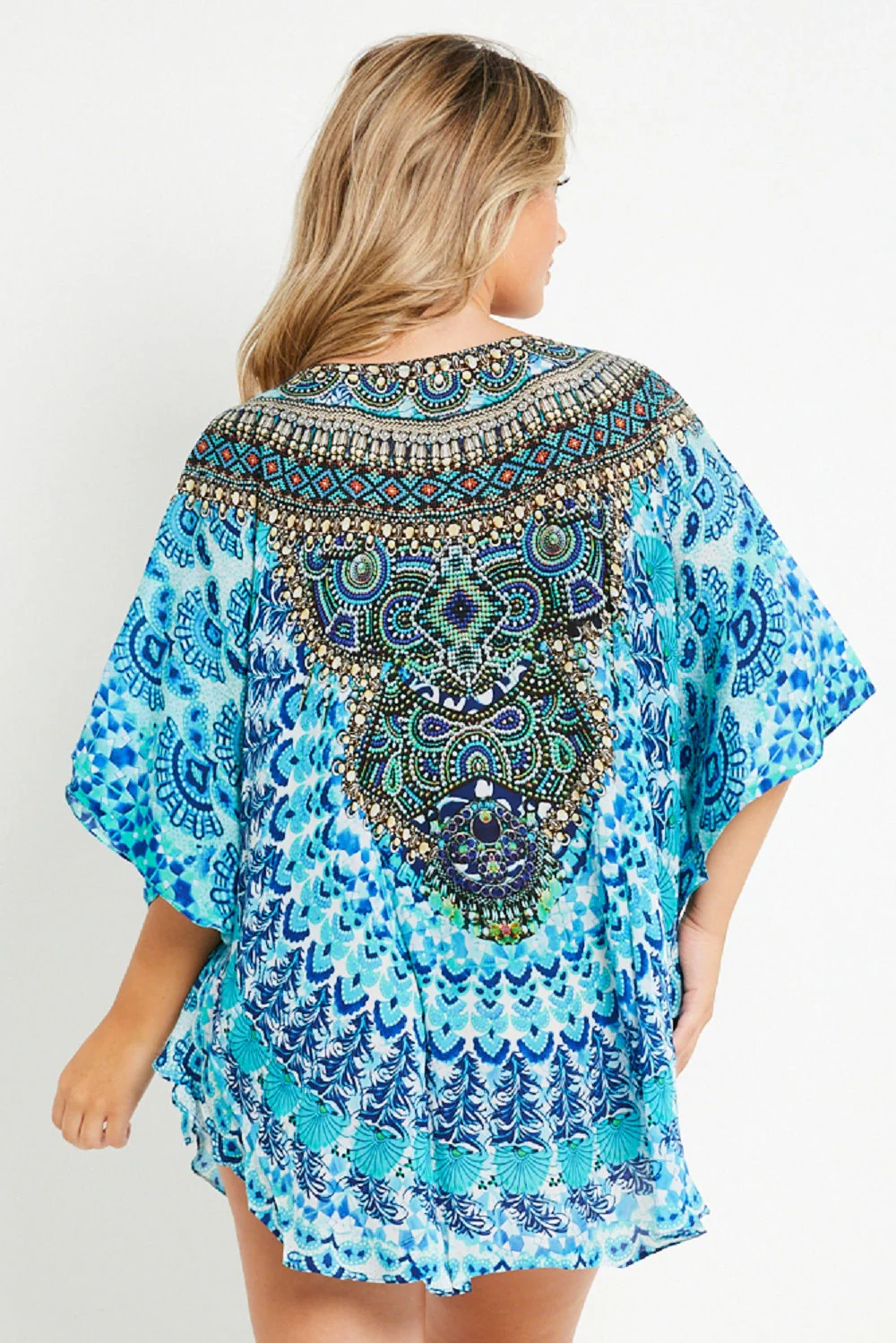 The Aftershock London Aqua Blue Short Kaftan is an elegant beach dress in a lightweight viscose. This style features a mandala print, a V-neckline with a crystal embellishment and a curved hem.
