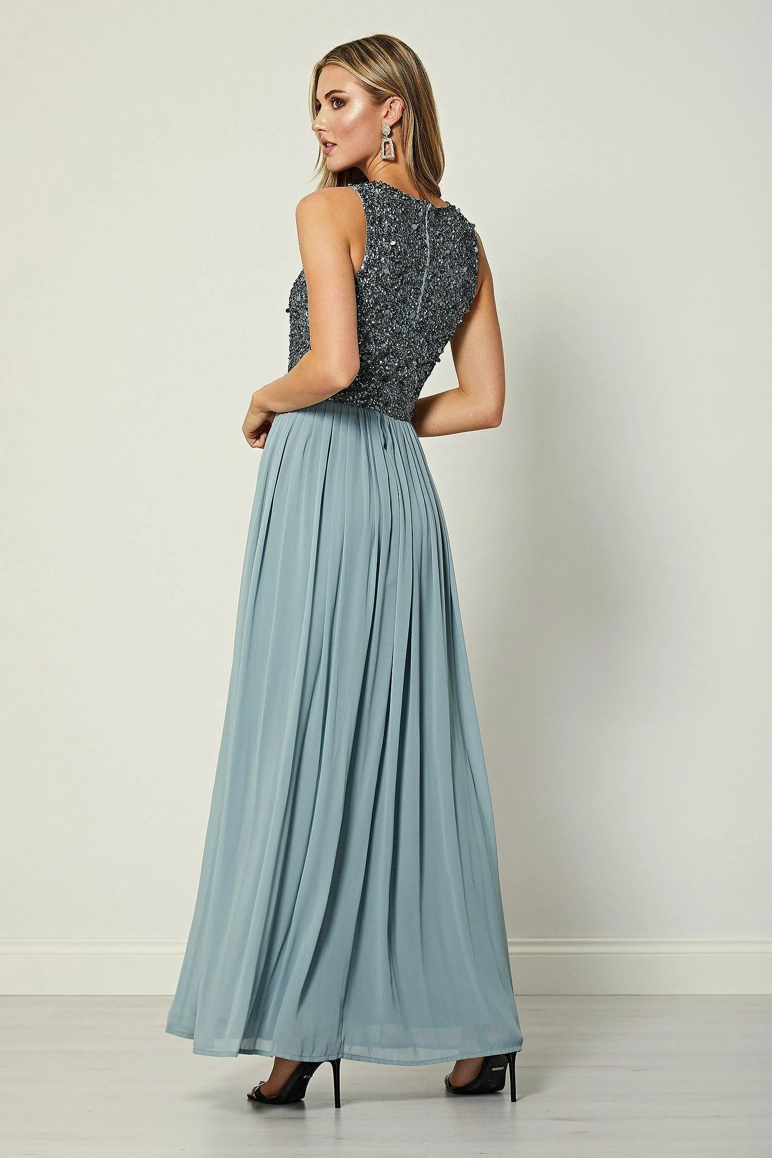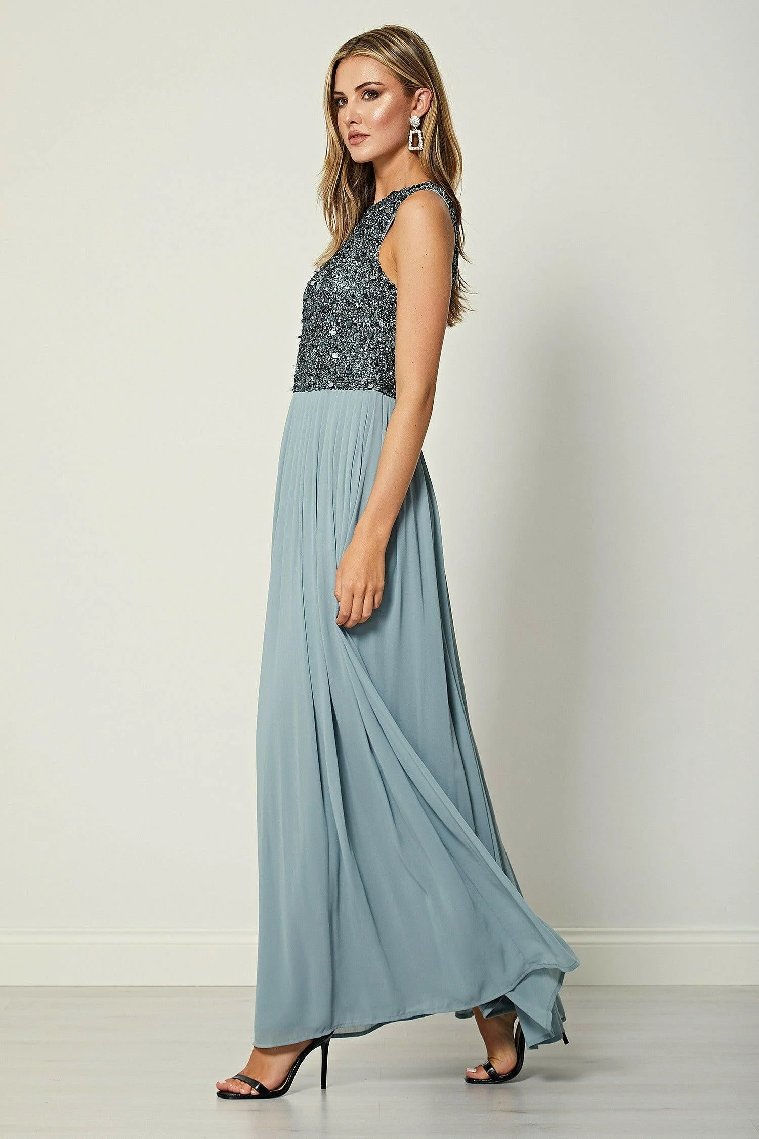 A mesh skirt and sequin top make up the Bridesmaid Sleeveless Embellished Beaded Maxi Dress in Grey by Aftershock London. A gorgeous embellished maxi dress, featuring embellished sequin details on the bodice, the perfect bridesmaids dress and event dress for you or your girls to wear!