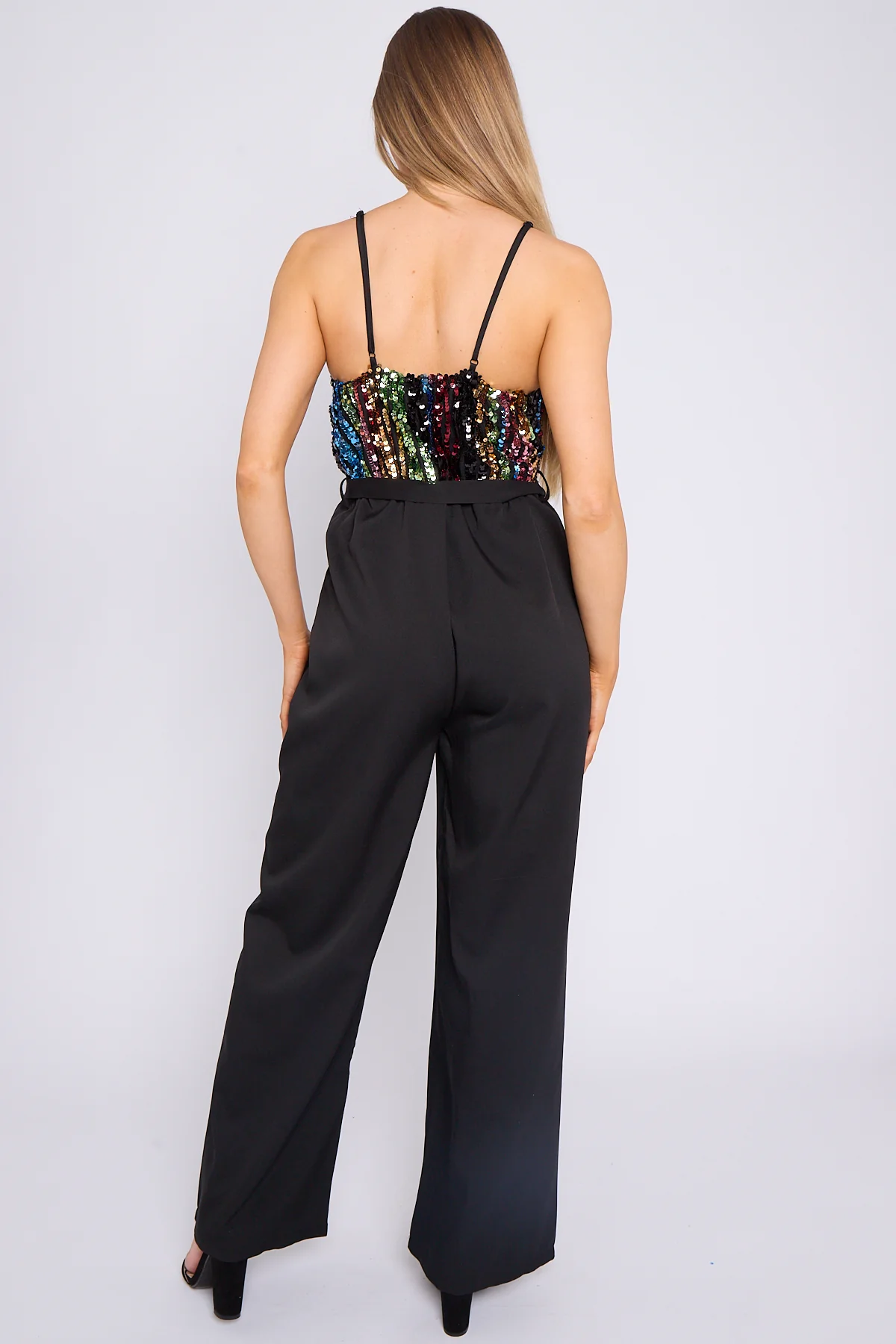 The Aftershock London Combined Jumpsuit in Black consists of a cami top embellished with multicolour sequins and wide leg trousers with matching tie belt. The cami top has a wrap over design with elastication at the back and adjustable straps.