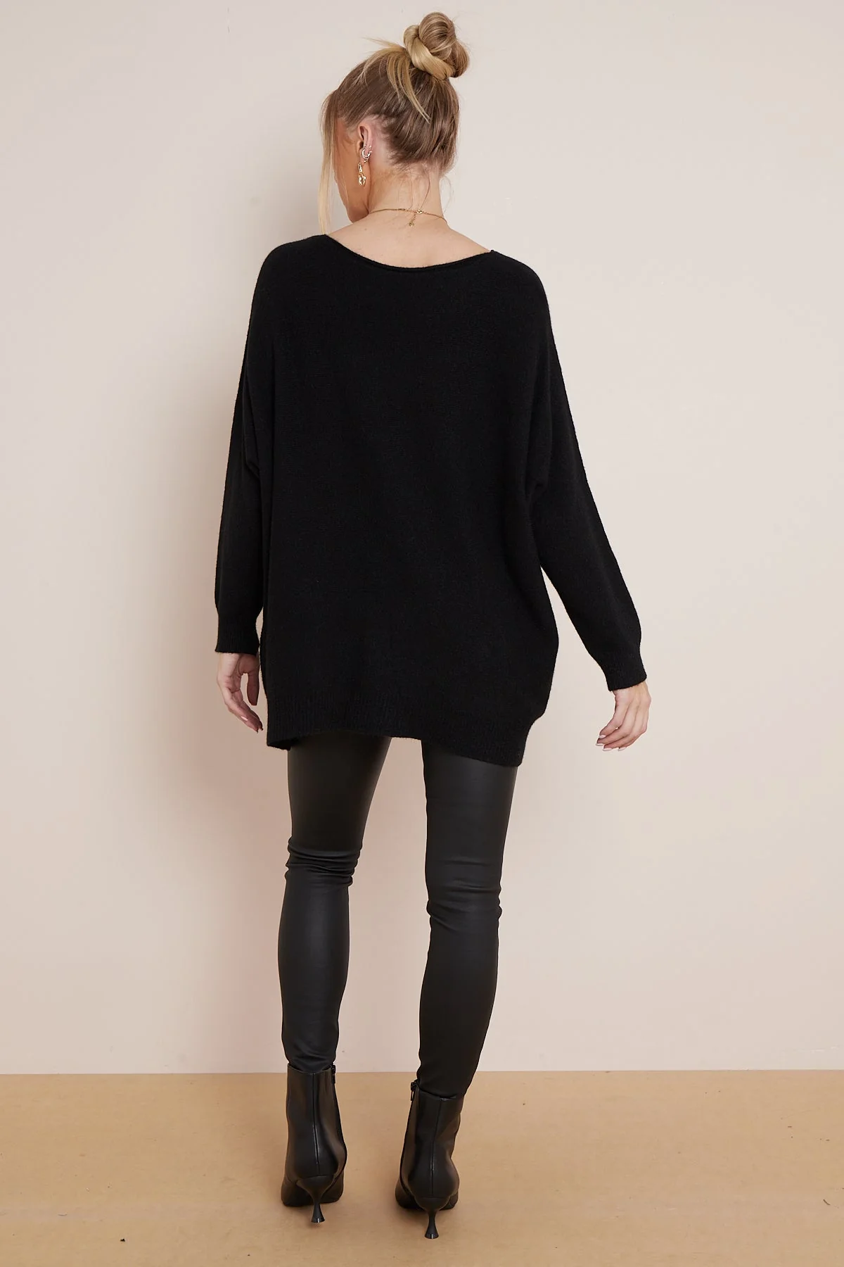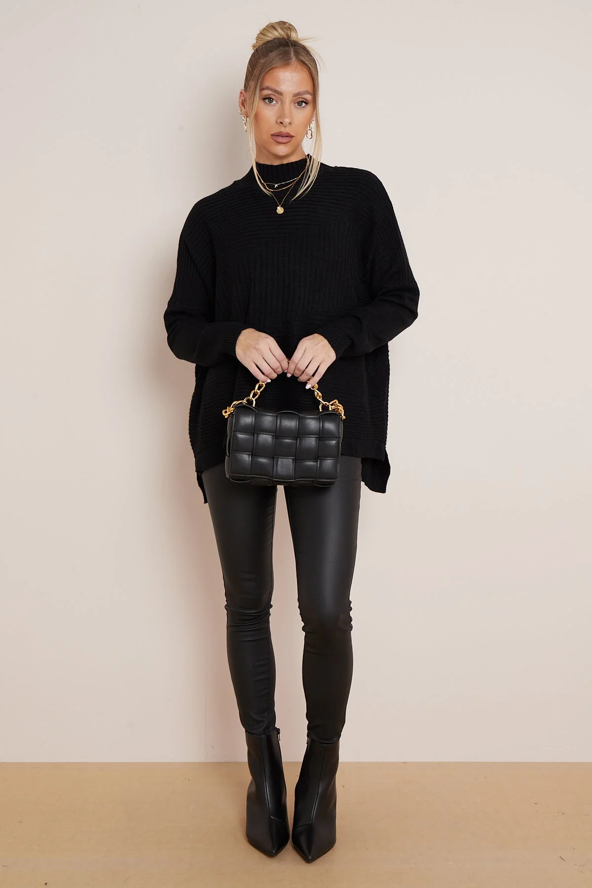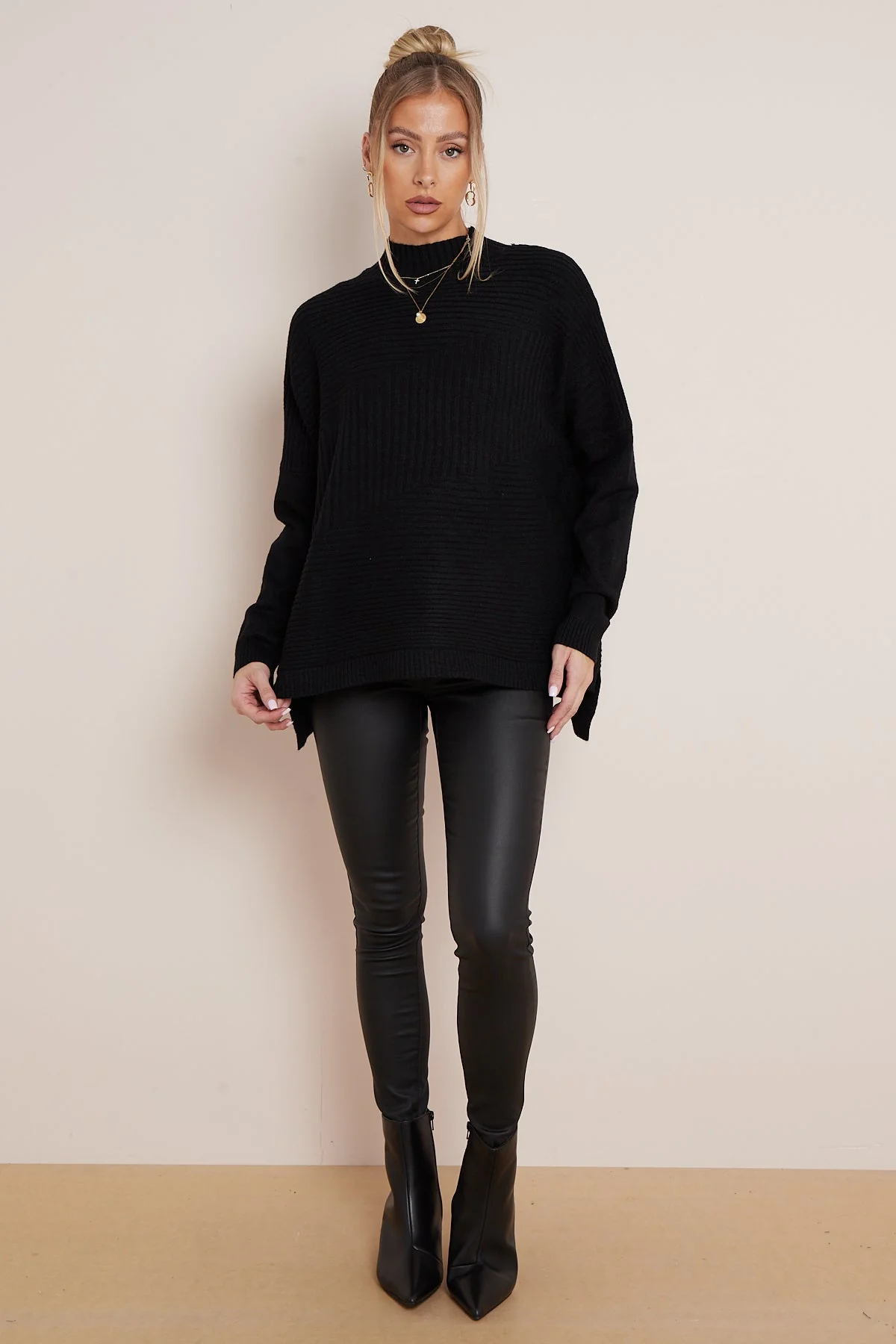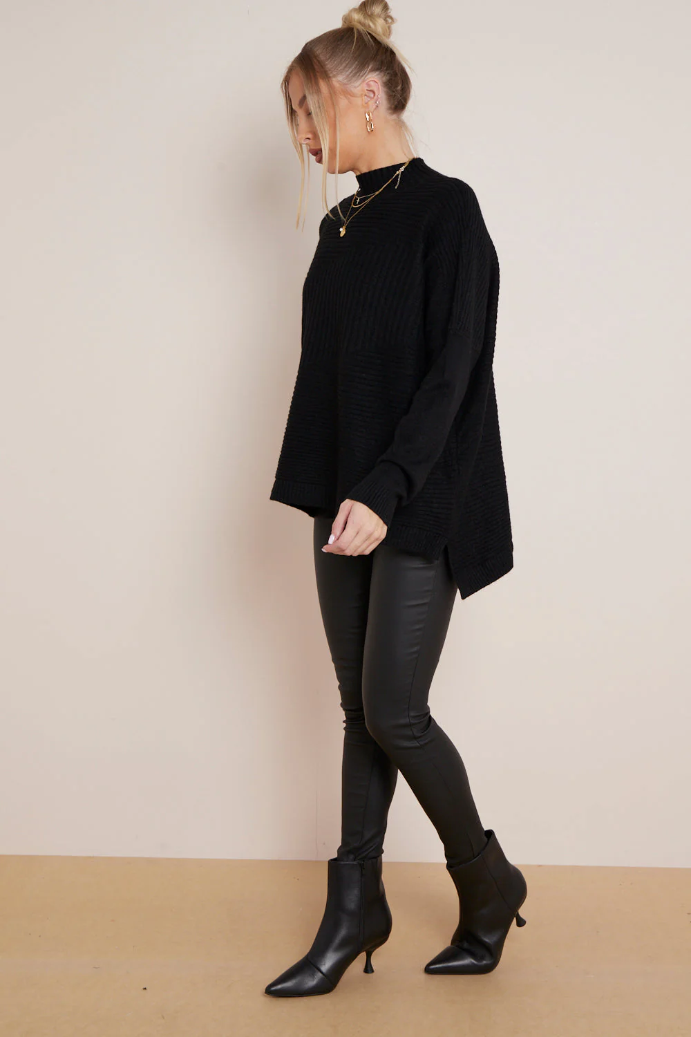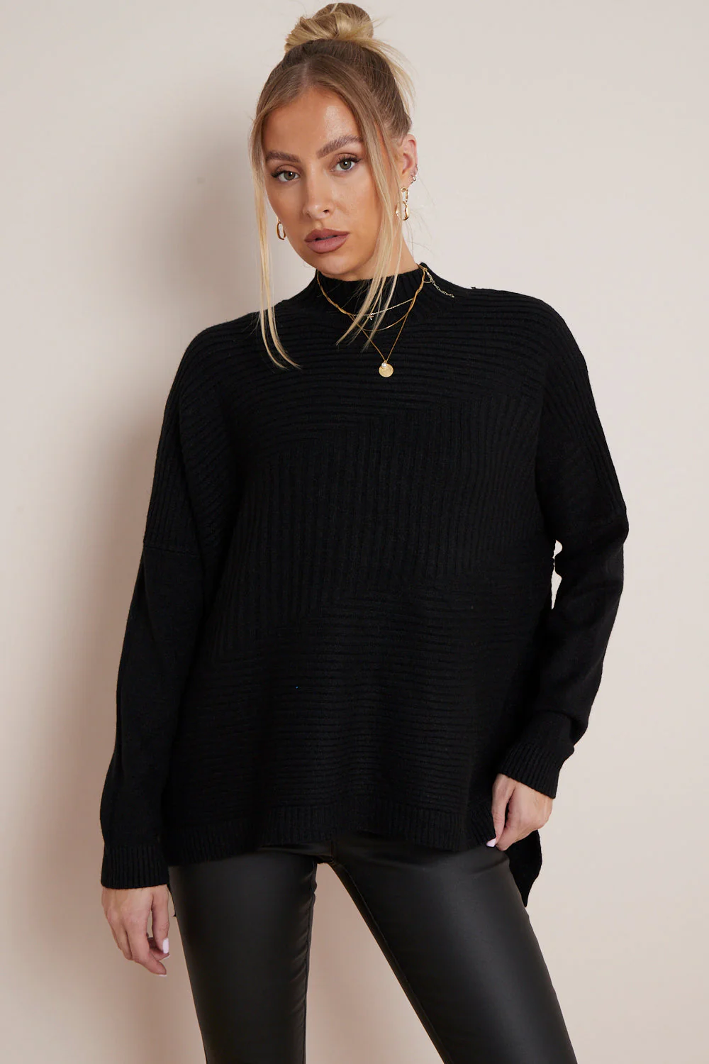 This Aftershock London High Neck Ribbed Jumper in Black is crafted from a soft viscose blend. It has a high neck, dropped shoulders and sleeves with ribbed cuffs. Designed with a ribbed bodice with asymmetric pattern, it has slits in the sides and is longer at the back.