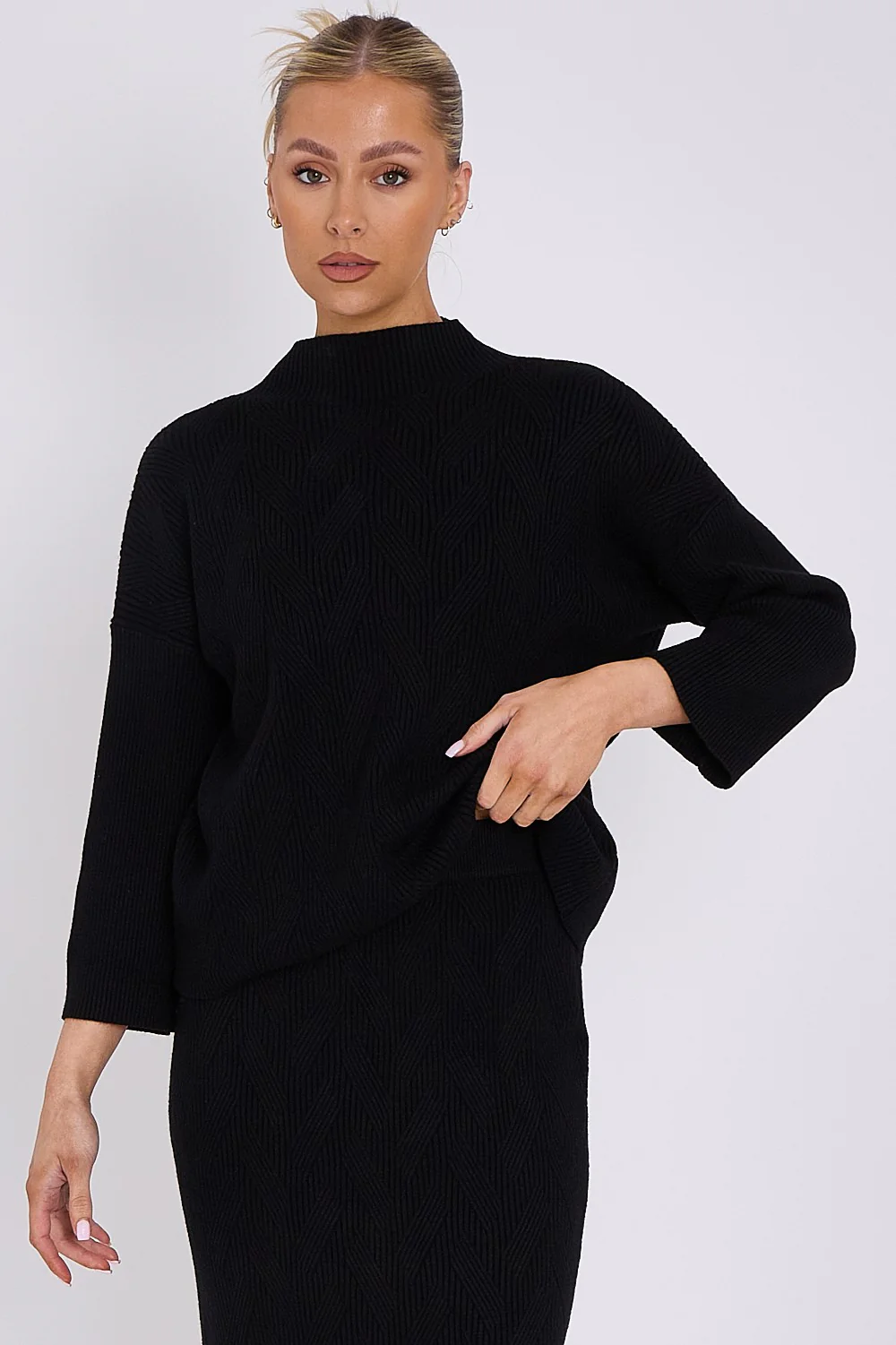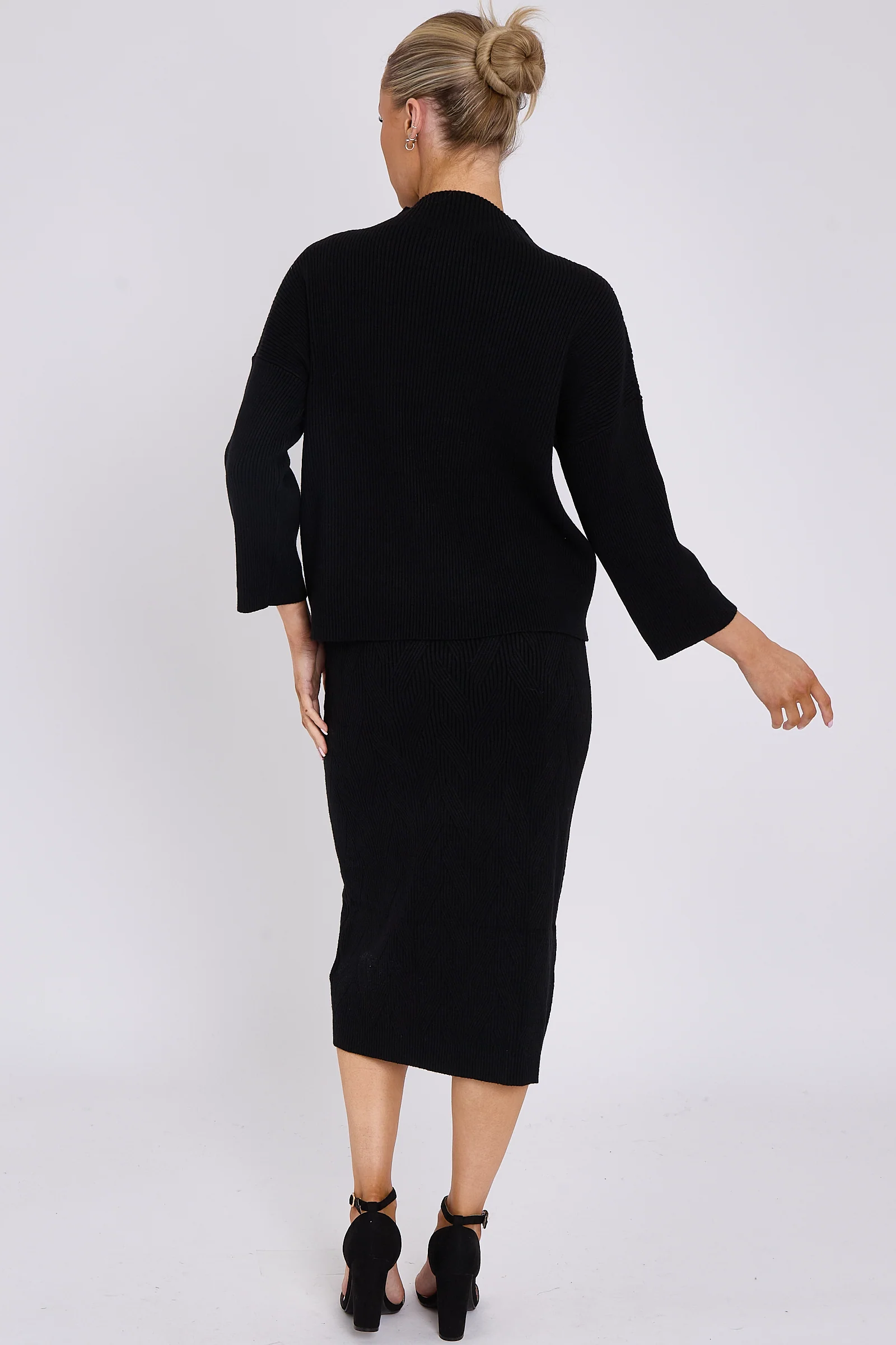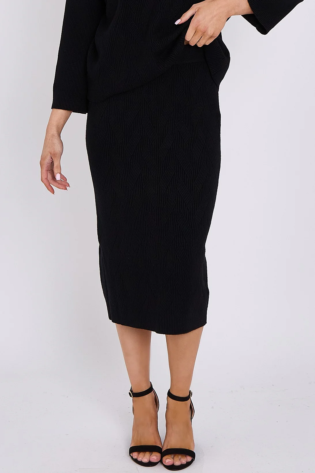 Crafted from a viscose blend, the Aftershock London Knit Pattern Midi Skirt in Black is a fitted skirt in a soft pattern knit. This comfortable midi skirt features a straight silhouette with a high waist with covered elastication. Matching Black Knit Pattern Jumper available.