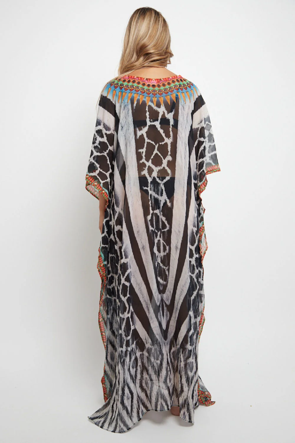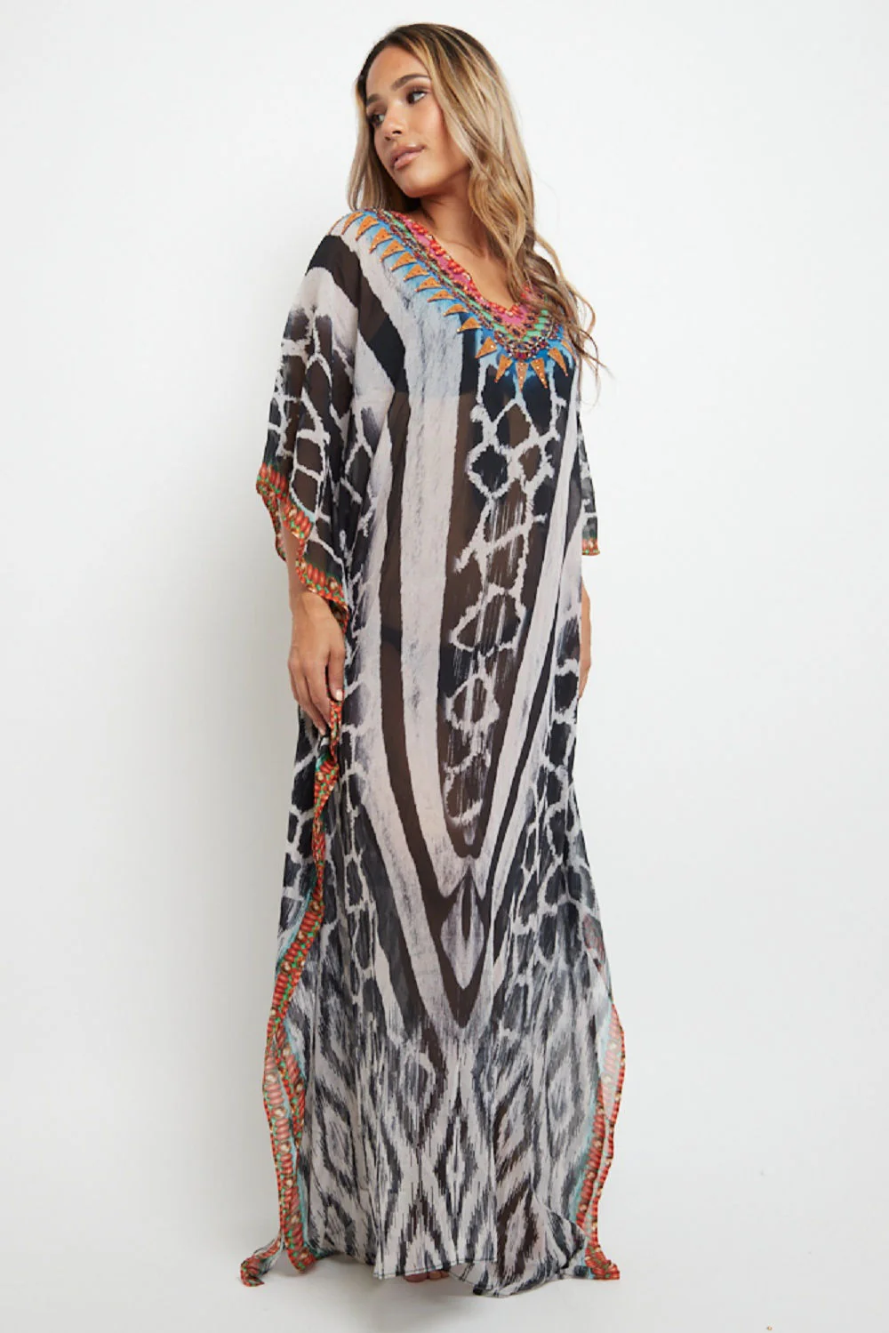 The Aftershock London Black Long Kaftan is an elegant beach dress in a lightweight viscose. This style features an animal print design and a crystal embellishment around the V-neckline.