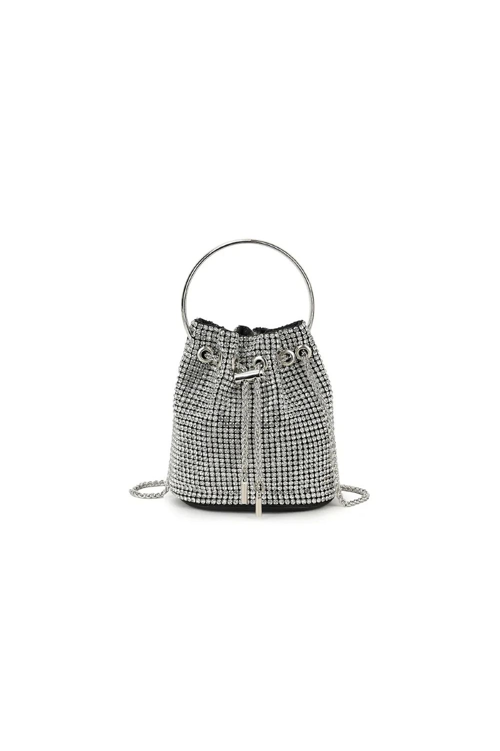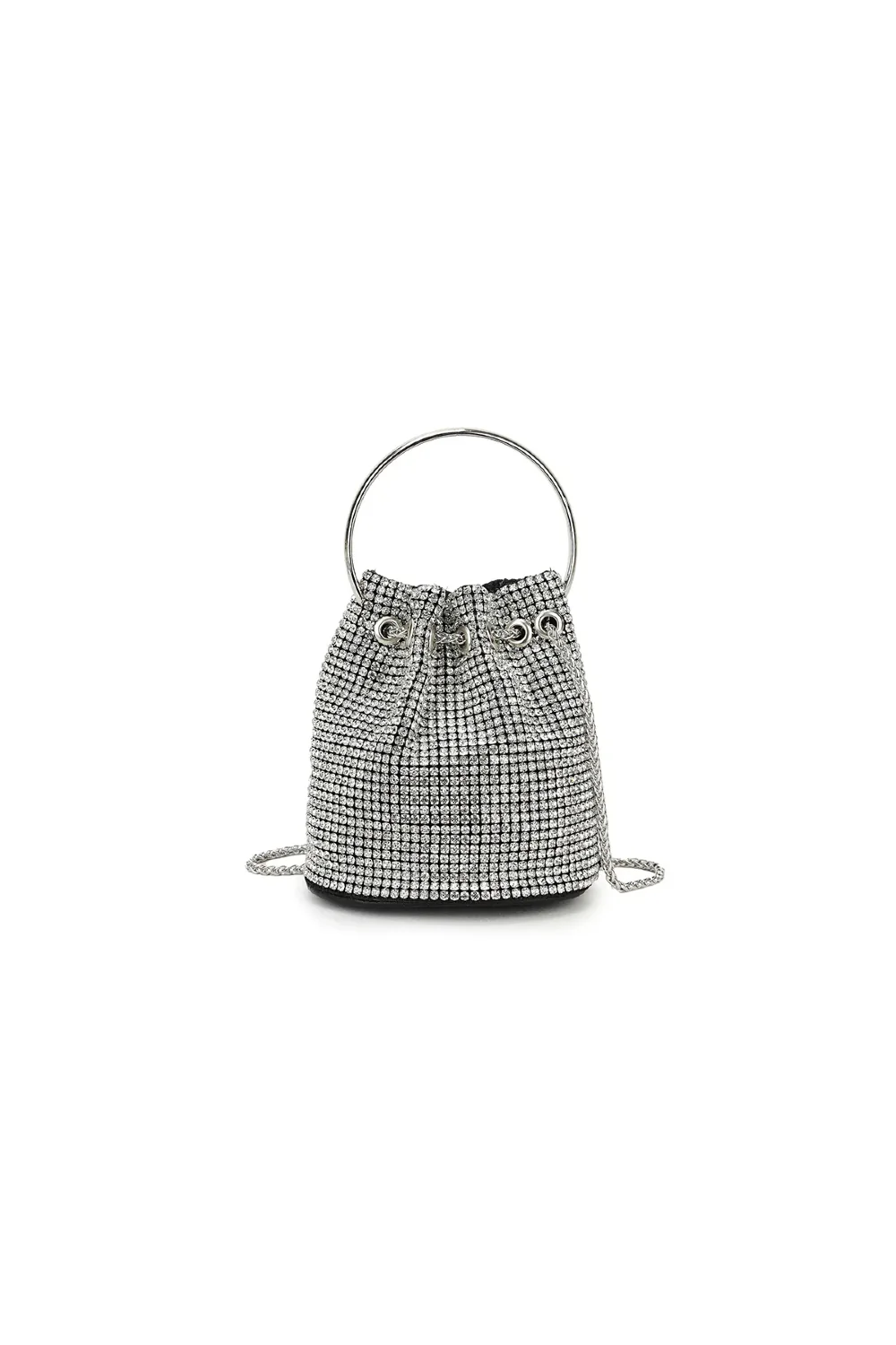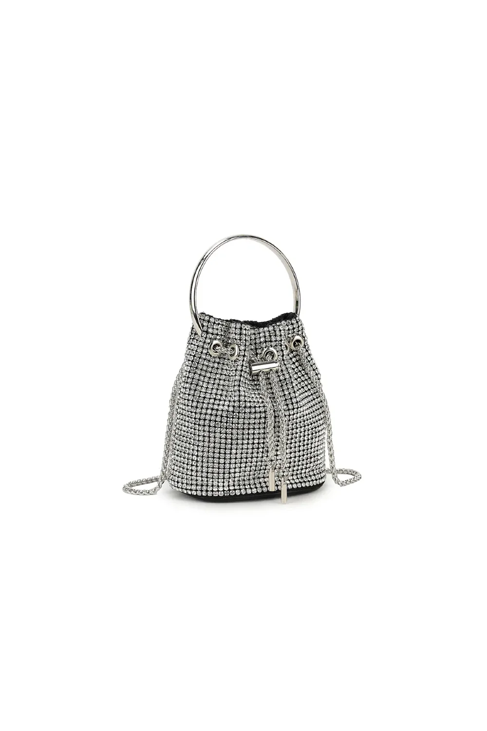 The Aftershock London Crystal Mesh Evening Bag in Silver features a statement round top handle, toggle fastening and interior lining.