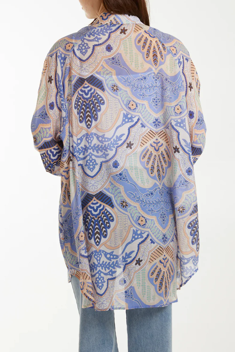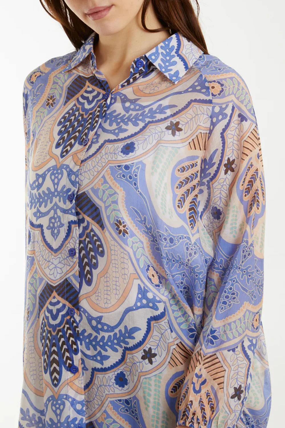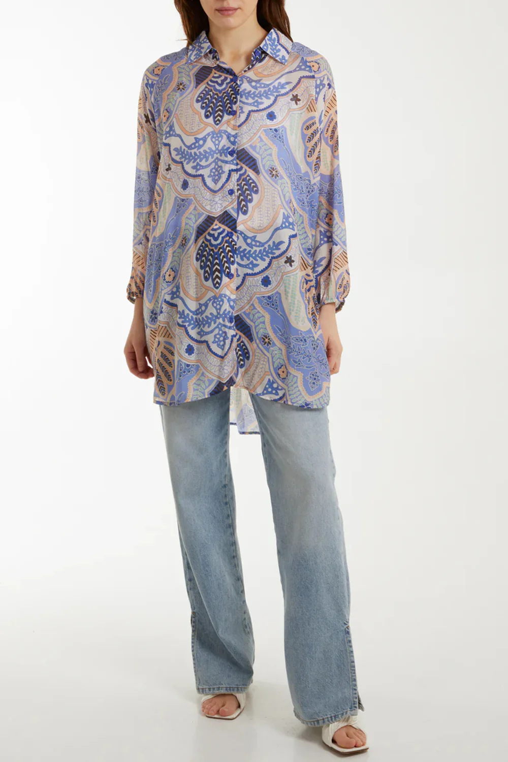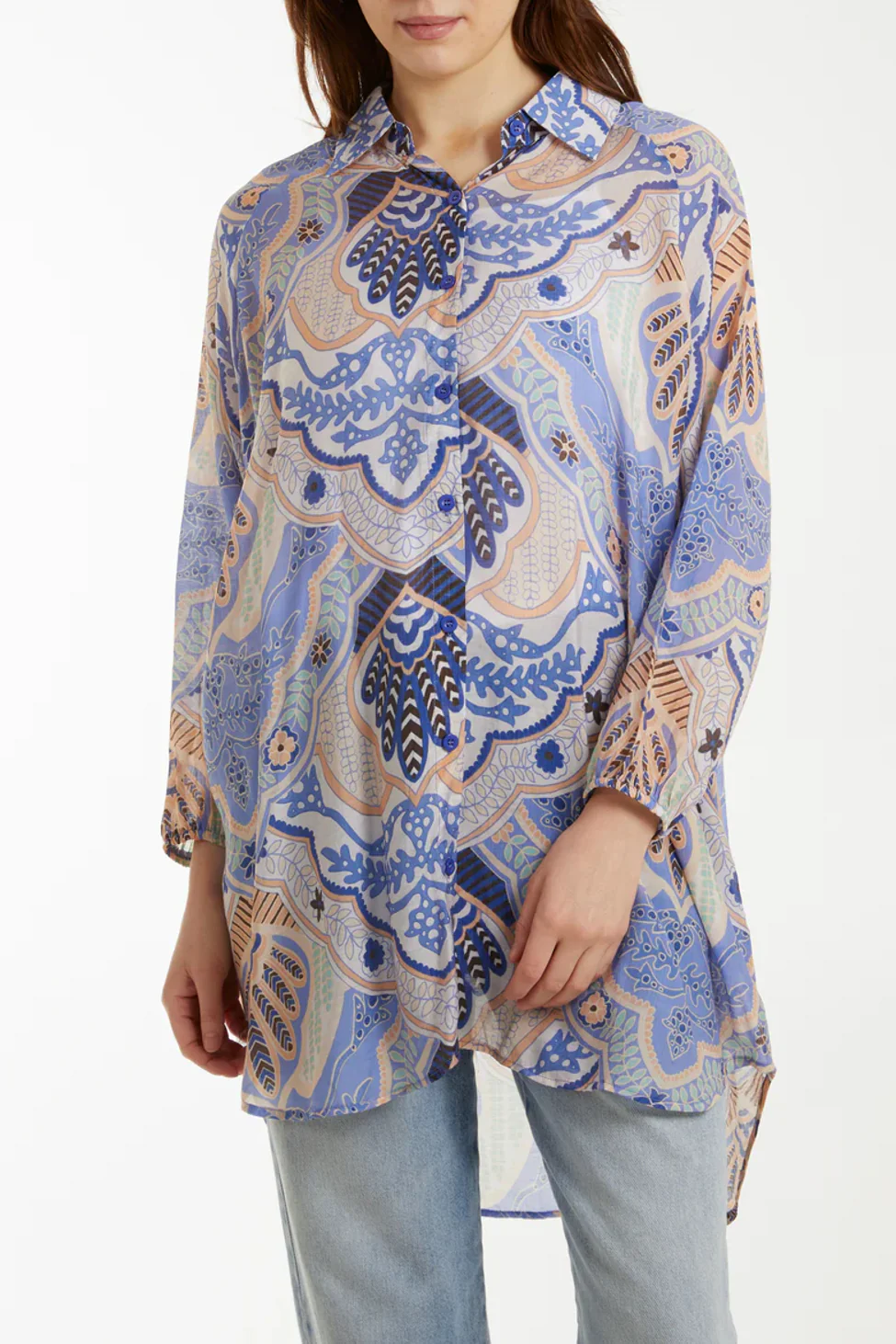 Crafted from a lightweight viscose blend, the Aftershock London Abstract Floral Print Long Sleeve Shirt in Blue features a longline design with a pointed collar, buttons down the front, dropped shoulders, long sleeves with elasticated cuffs and a rounded hem.