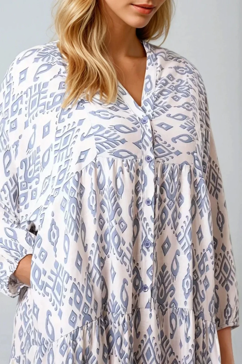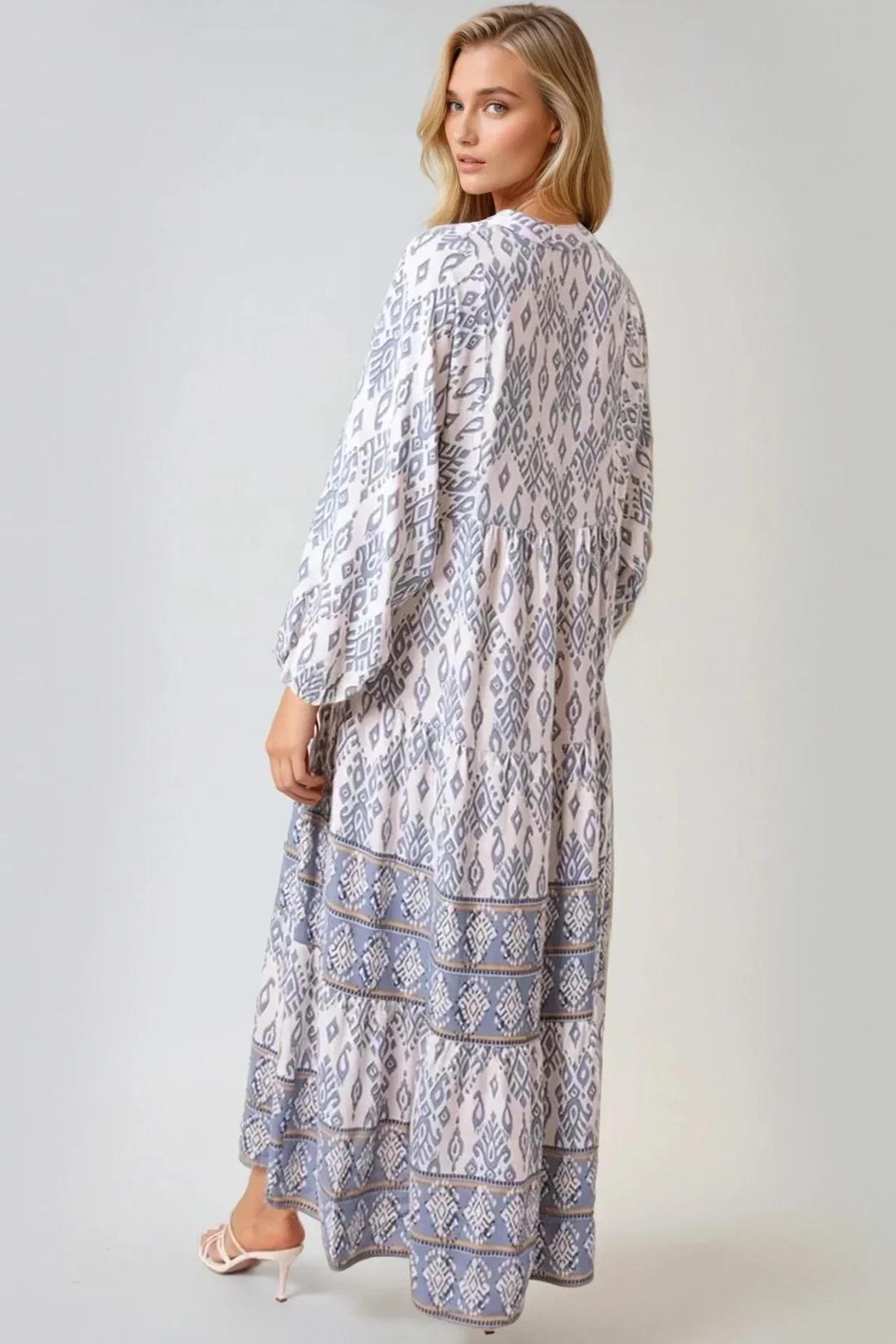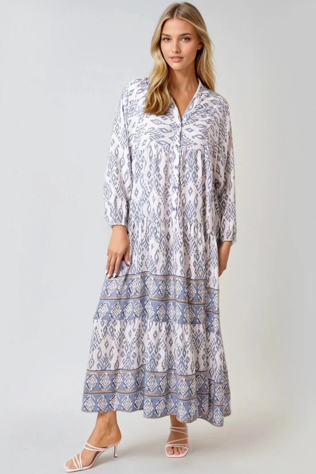 Featuring a flattering V neckline and long sleeves with elasticated cuffs, the Aftershock London Long Sleeve Smock Maxi Dress in a stunning blue combines comfort and style beautifully. The buttoned front adds a touch of sophistication, while the tiered design flows gracefully with every step you take. Crafted from soft viscose fabric, it’s perfect for any occasion, ensuring a relaxed fit that hugs you just right. Embrace your unique style with its eye-catching Ikat print and enjoy the perfect blend of chic and casual.