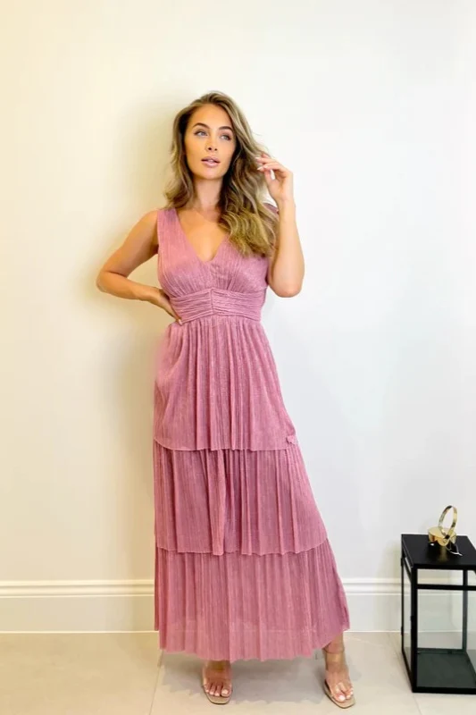CHANTIA PINK PLISSE MAXI DRESS WITH TIERED SKIRT