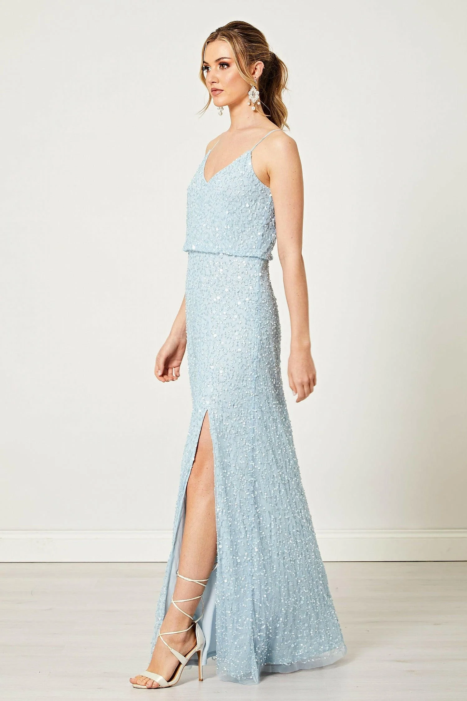 The Scatter Embellished Sequin Maxi Dress in Light Blue by Aftershock London is the timeless gorgeous event outfit you need! Featuring a pull in waist and tie up back, this Pink embellished dress has adjustable cami straps for a comfortable fit. There is a slit in the leg to add a bit of glam.