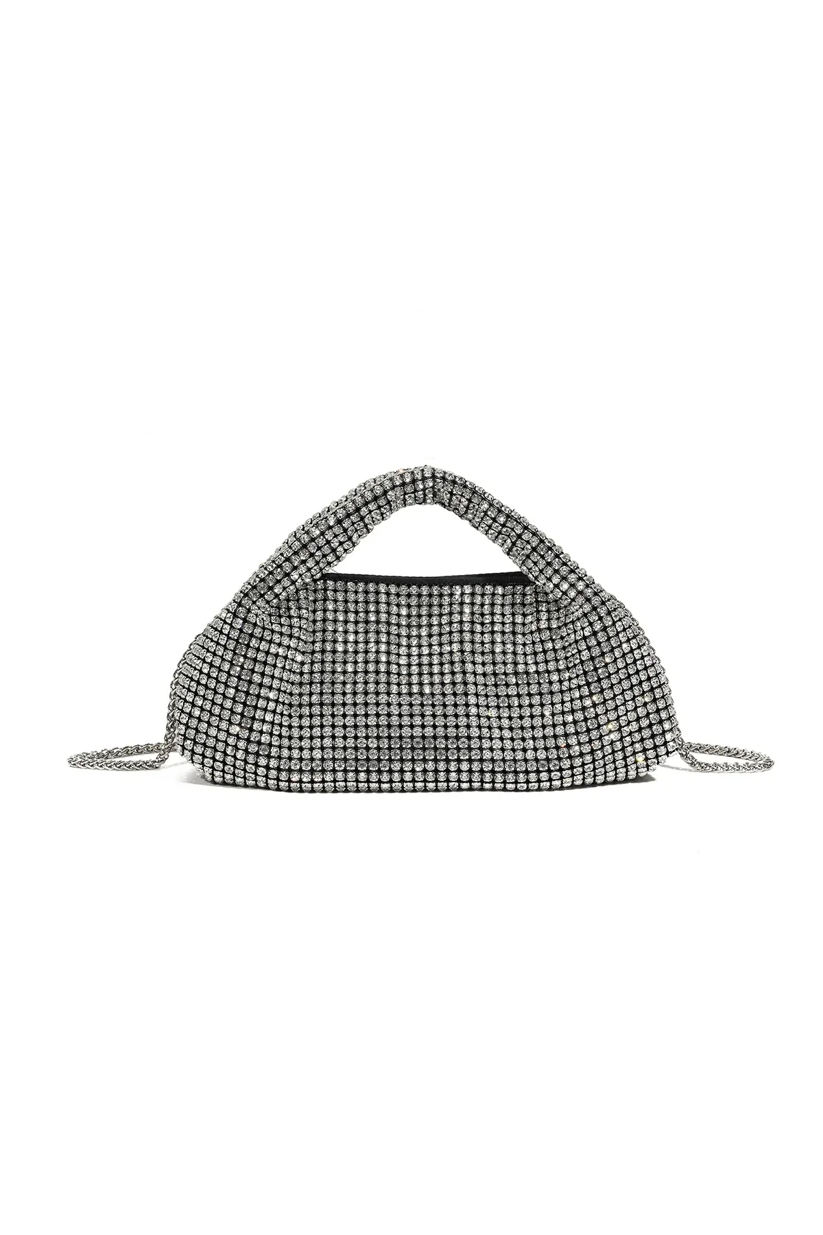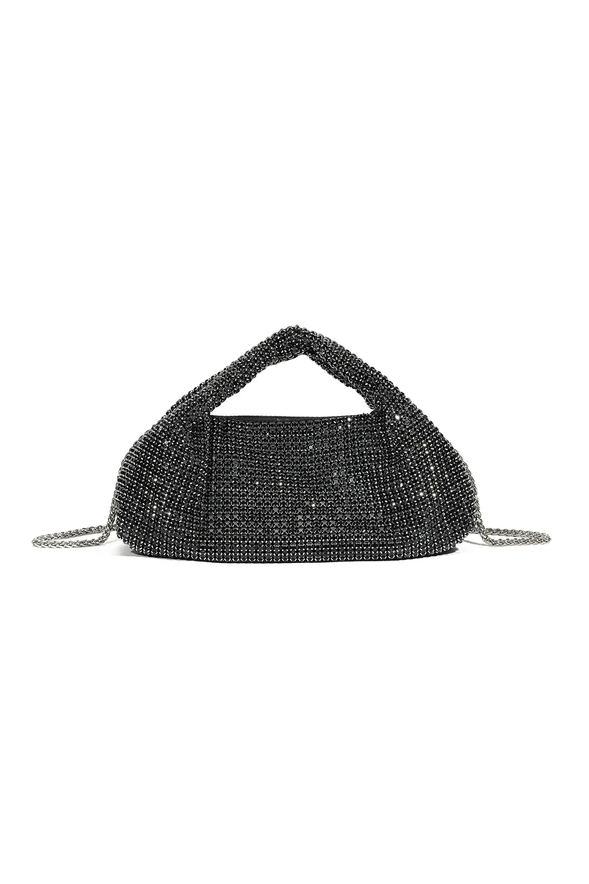 The Aftershock London Crystal Evening Bag is a statement evening bag that features top handle, removable chain and interior lining.