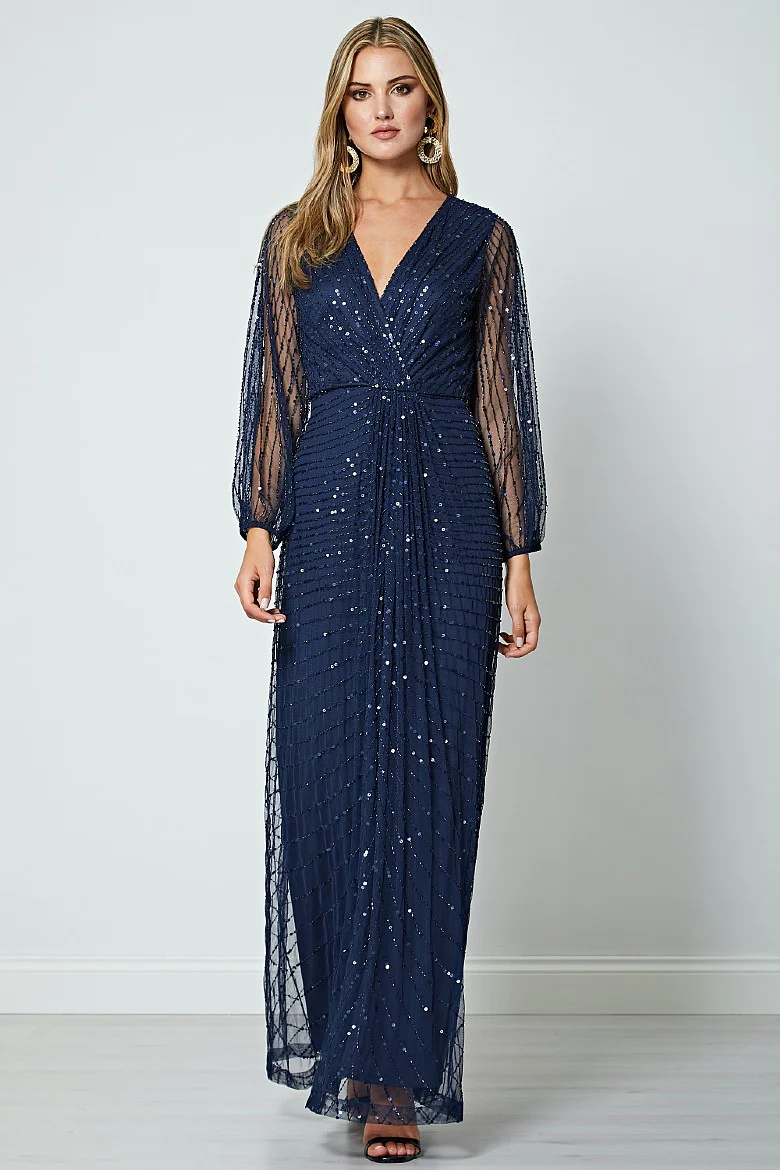The Daisianne Sequin Long Sleeve Wrap Maxi Dress by Aftershock London is the epitome of elegance and glamour. Featuring a V neck and sparkling sequin beaded mesh fabric, this dress is perfect for any special occasion. The wrap cut and waistline seam provide a flattering fit, making it the ideal choice for bridesmaids and fancy events. Also available in Emerald Green, Berry and Lilac.