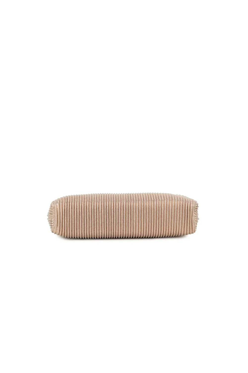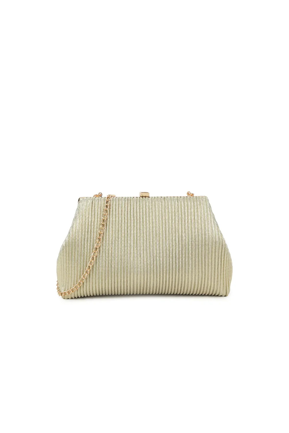 Crafted from metallic fabric, the Aftershock Gold Glitter Clutch Bag features statement ribbed design, snap closure and a detachable chain. Lined.