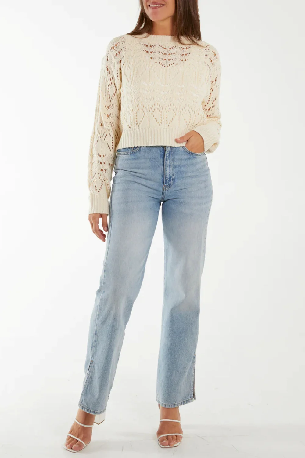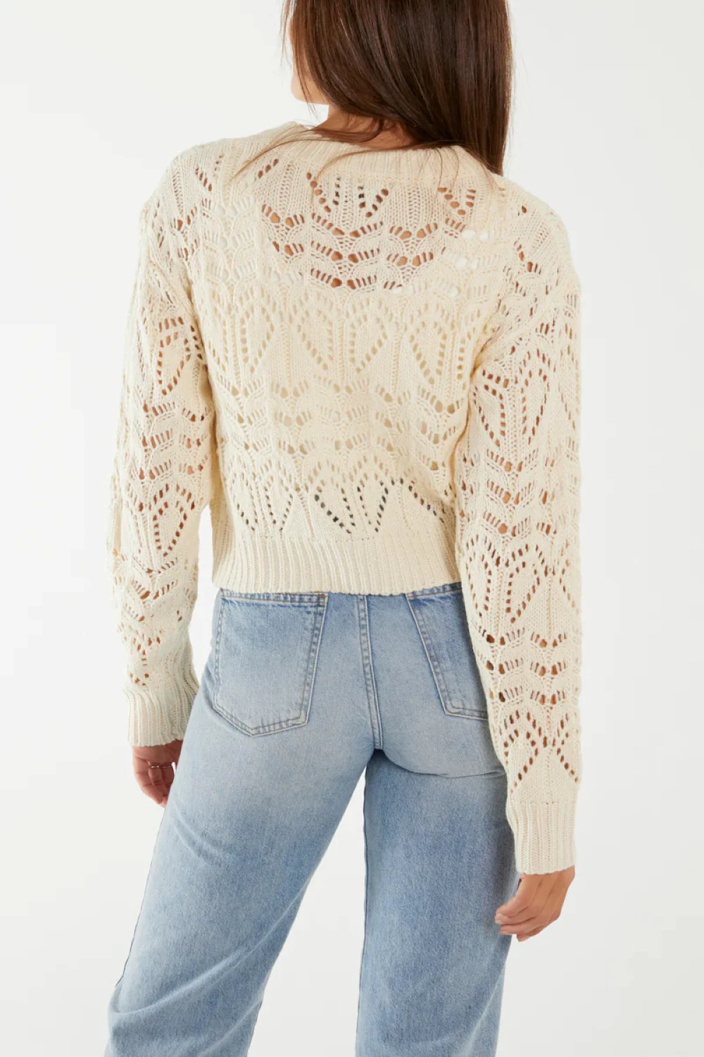 The Aftershock London Pointelle Knit Crop Jumper in Ivory features a beautiful open knit design with a ribbed hem and neckline and cropped fit with long sleeves.