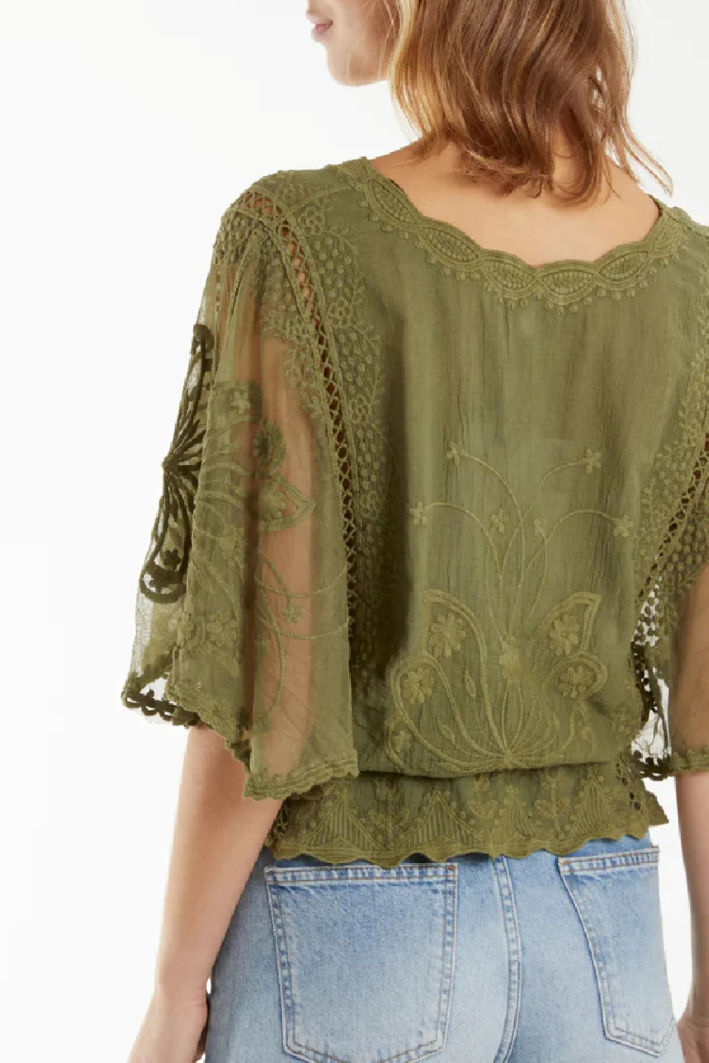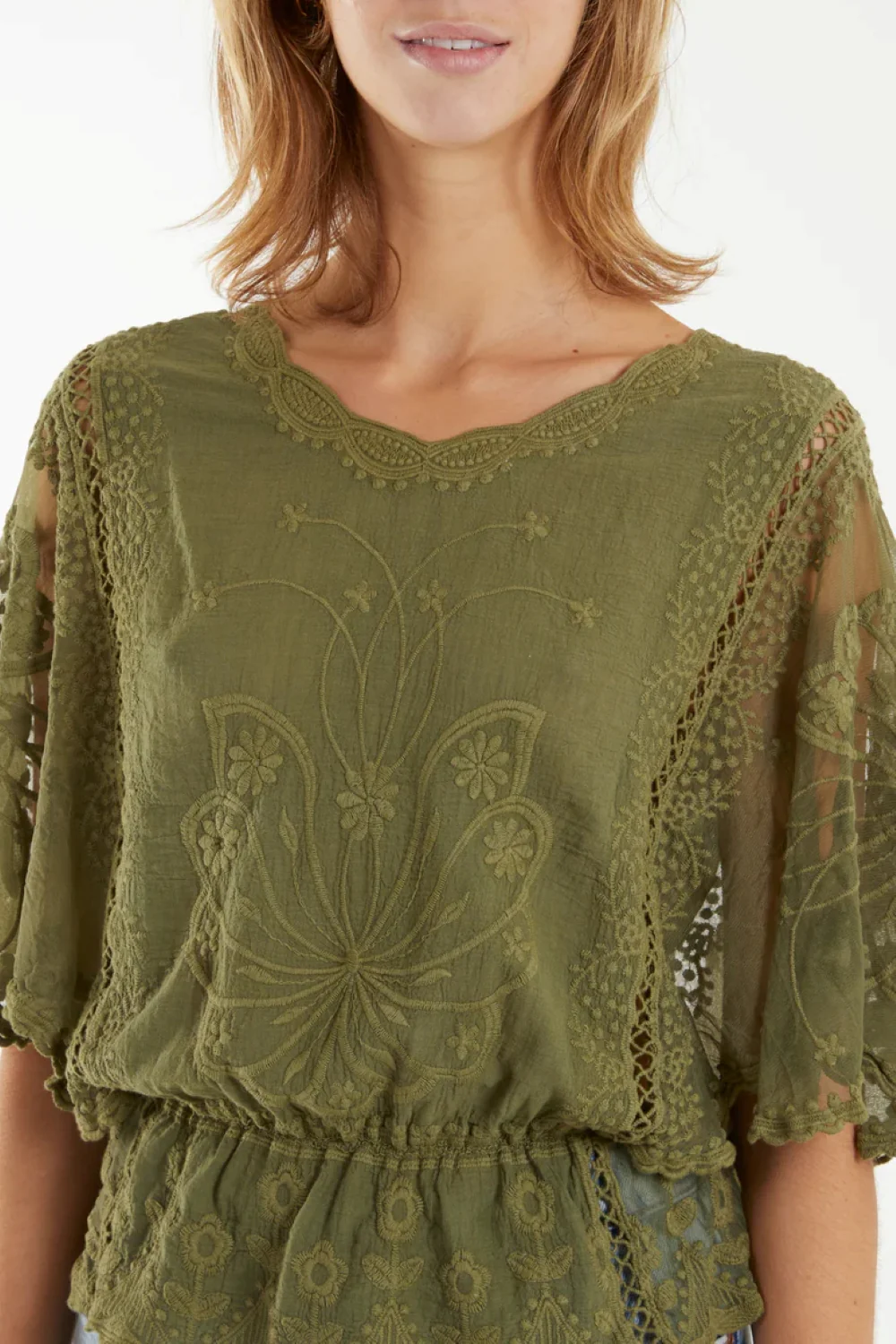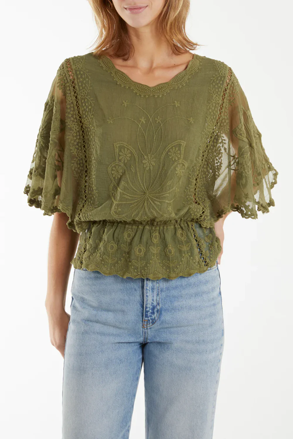 The Aftershock London Floral Lace Butterfly Sleeve Blouse in Khaki features a beautiful floral lace design with elasticated waist, round neckline and relaxed fit with butterfly sleeves.