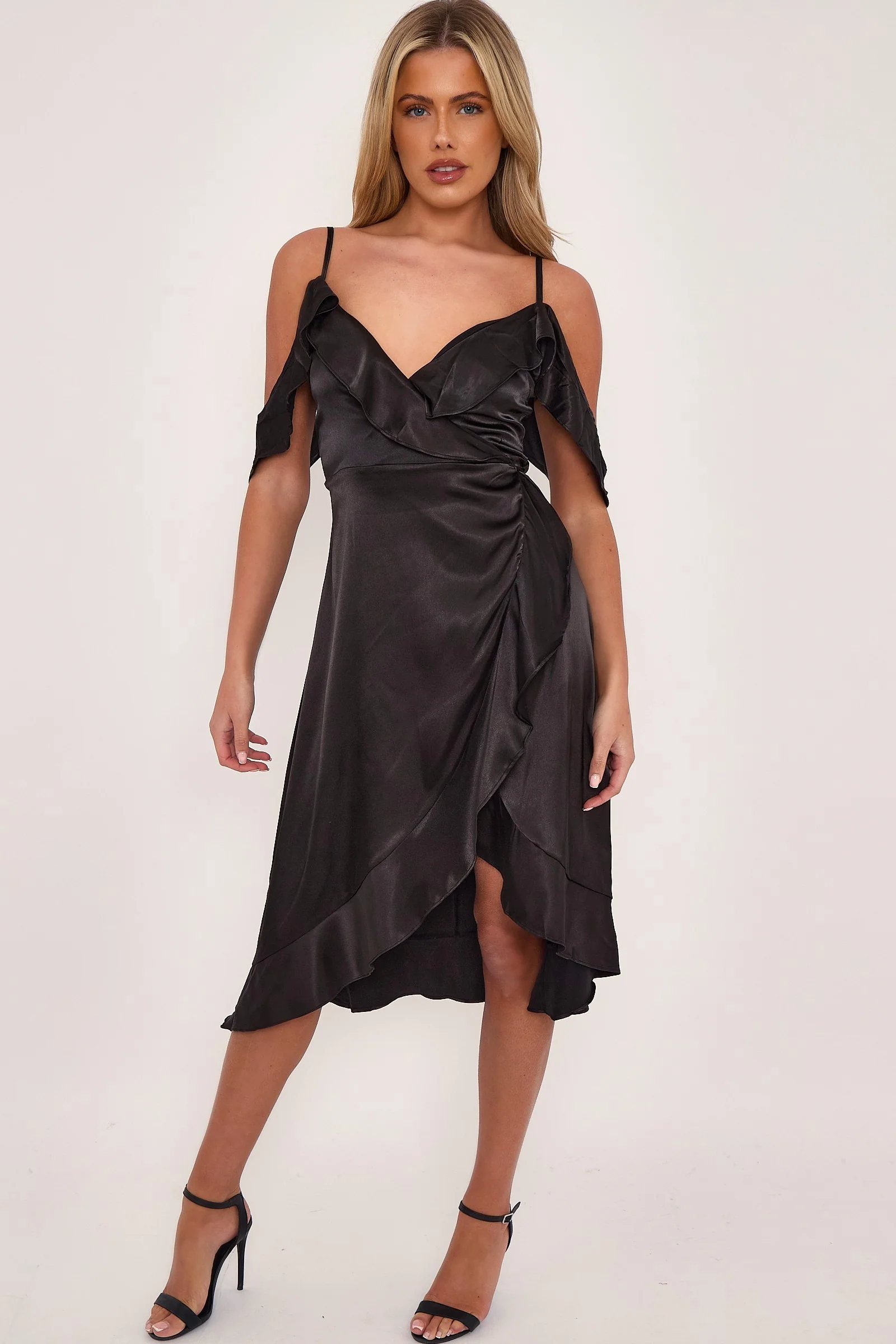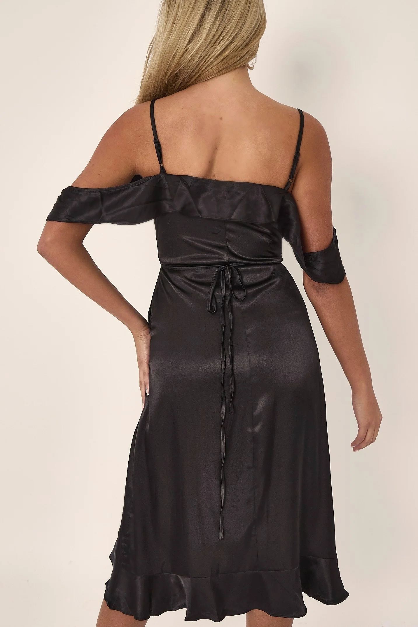 Decorated with romantic frills, the Aftershock London Off Shoulder Satin Midi Dress features a wrapover design with tie fastening and adjustable shoulder straps.
