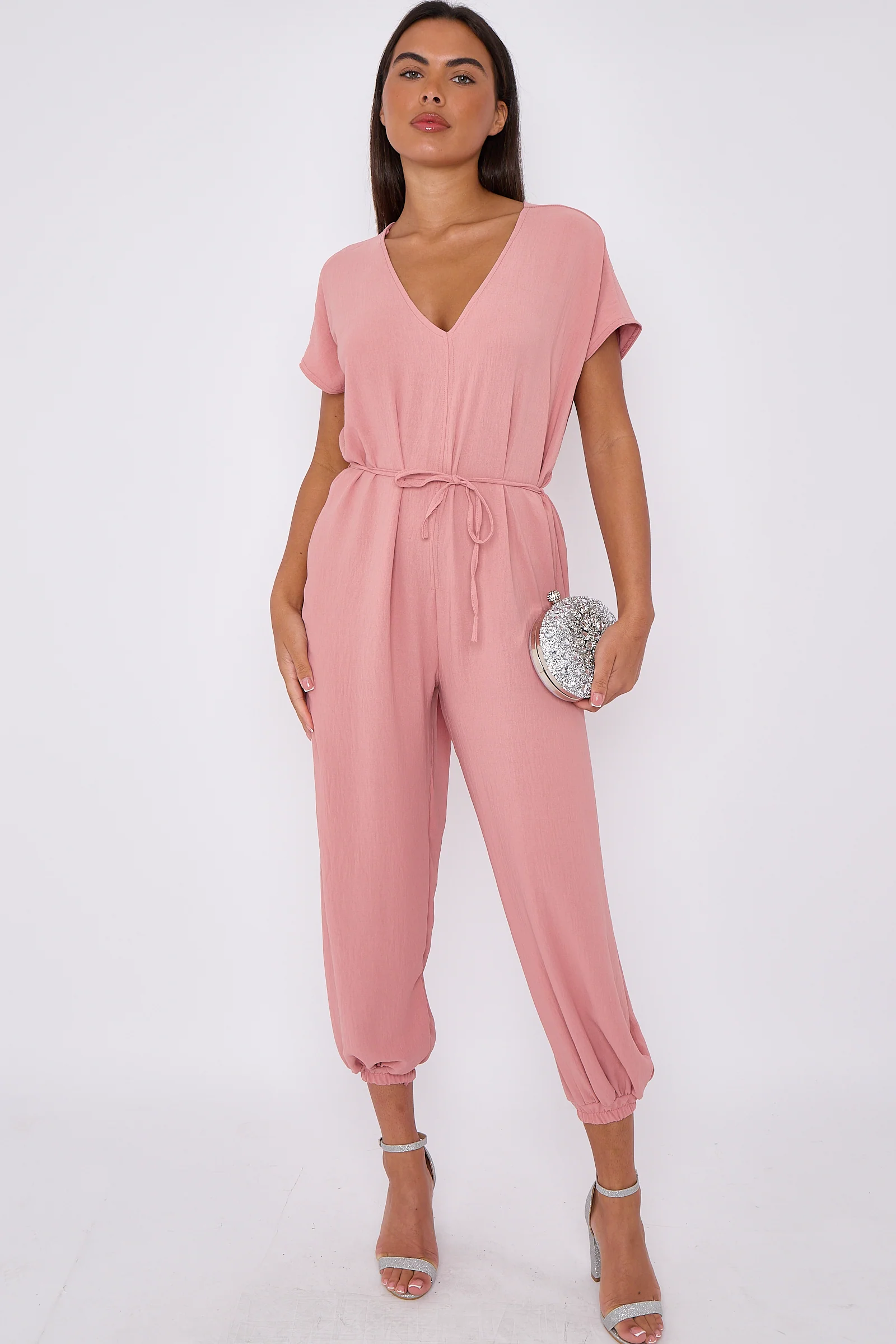 The Aftershock London Belted Jumpsuit in Pink features a V-neckline and short sleeves, a tie belt in the same fabric, a fastening at the back with buttons and elasticated hems. Beautiful, flattering shape to take you effortlessly from day to night.