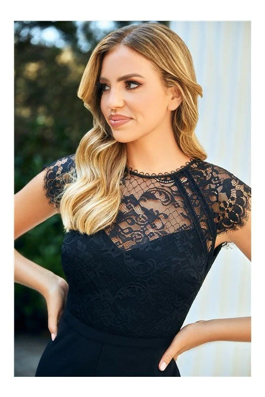 A jumpsuit with serious wow factor! This stunning jumpsuit by Aftershock London features beautiful eyelash lace covering the neckline top, lace cap sleeves and wide leg trousers. This is the jumpsuit you need for that special occasion.