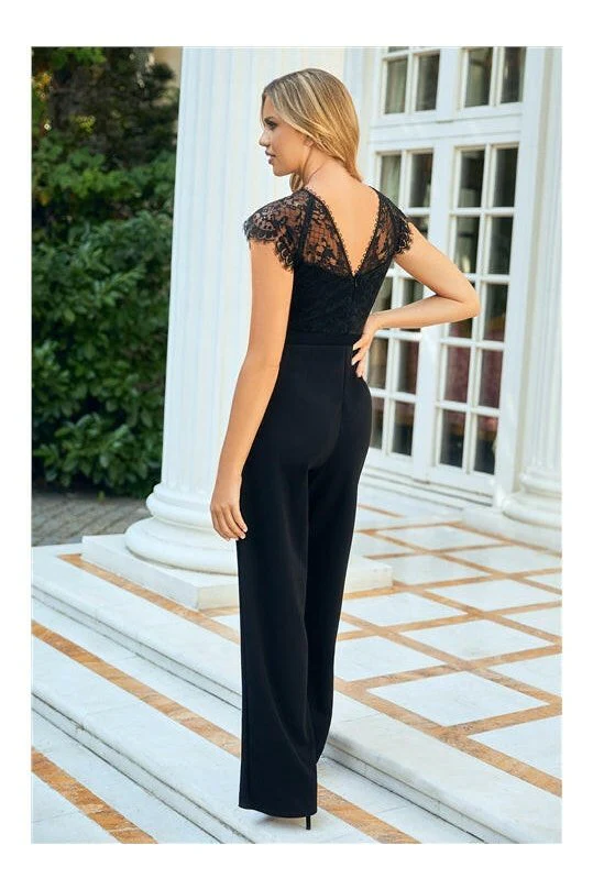 SEVEYN BLACK EYELASH LACE TOP JUMPSUIT WITH STRETCH WIDE LEG TROUSERS