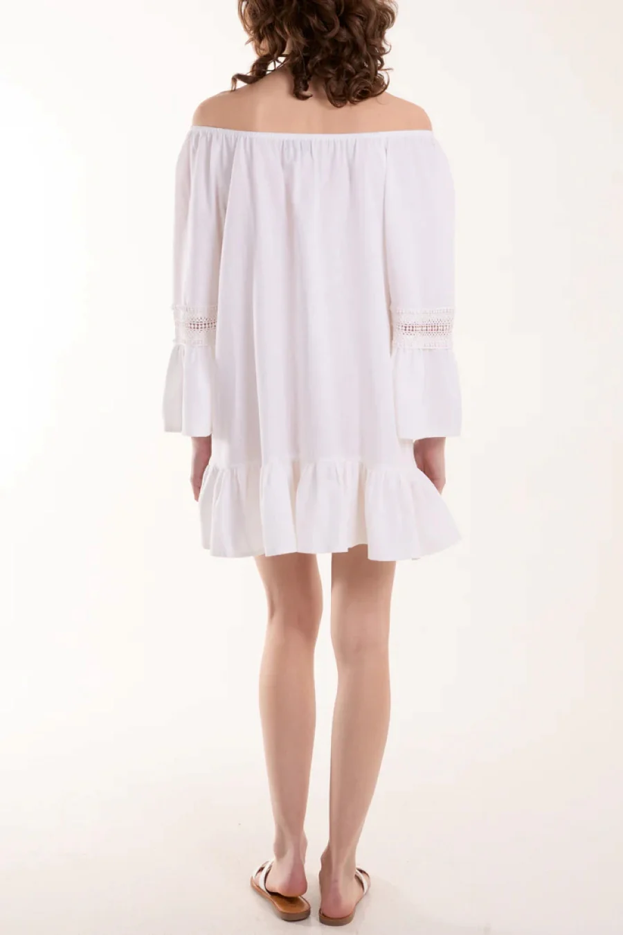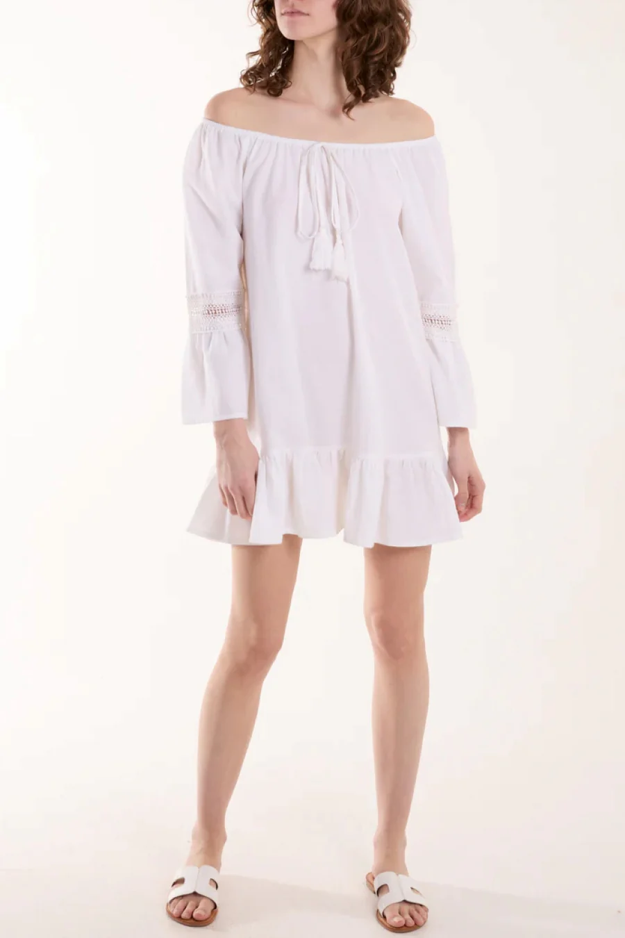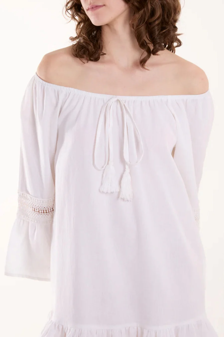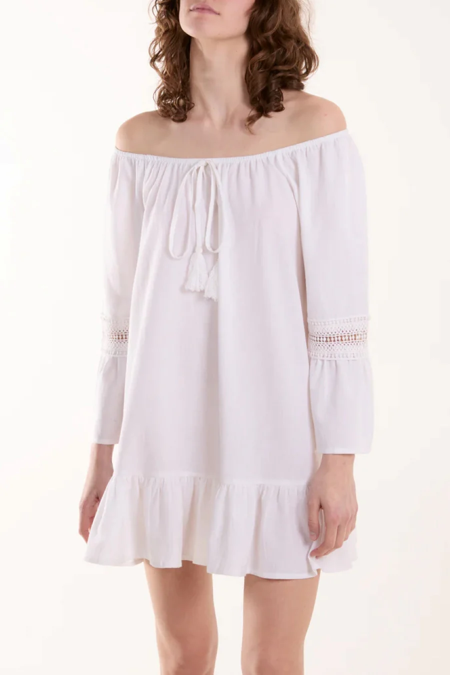 The Aftershock London Lace Trim Bardot Mini Dress in White is made from lightweight, breathable cotton. It features a beautiful mini length silhouette with bardot neckline and long sleeves. Lace trim and tassels finish the design.