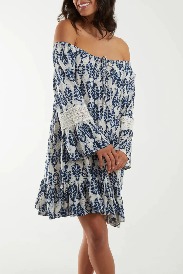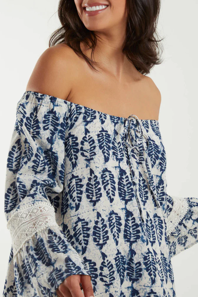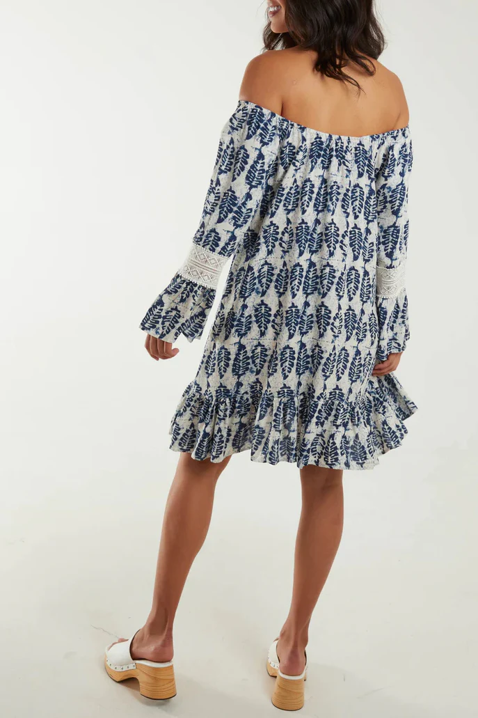 White Navy Leaf Print Bardot Mini Tunic Dress