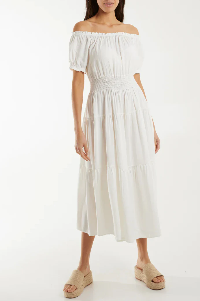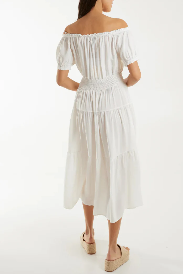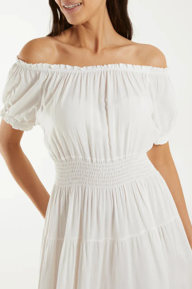 The Aftershock London Shirred Bardot Midi Dress in White is made from lightweight, breathable viscose. It features a flattering off-shoulder design with shirred waist and puff sleeves.