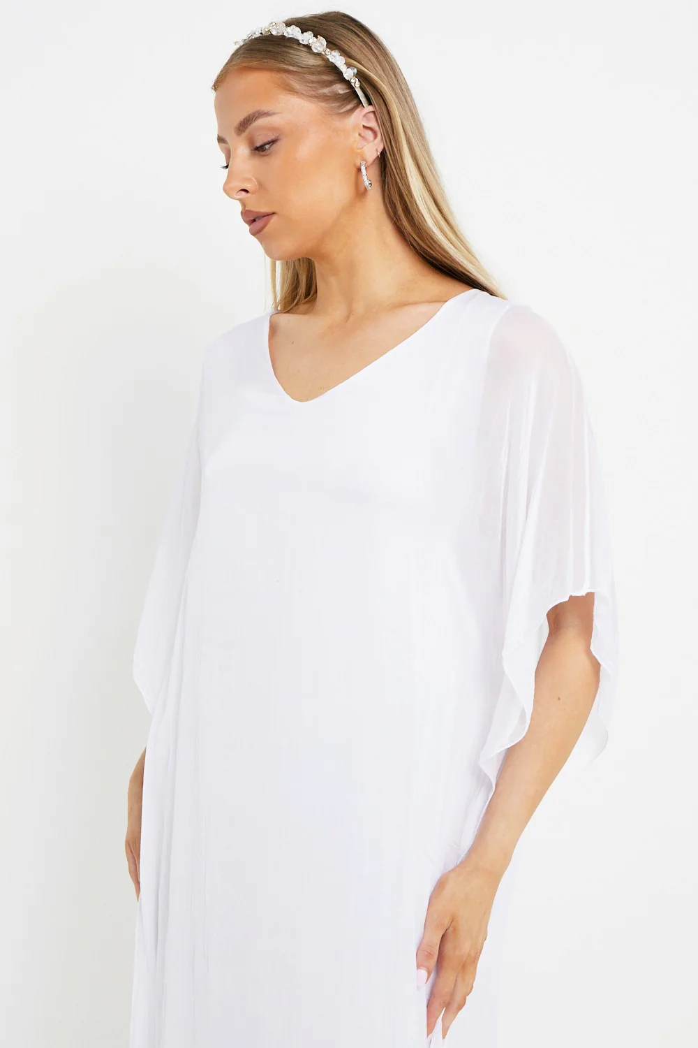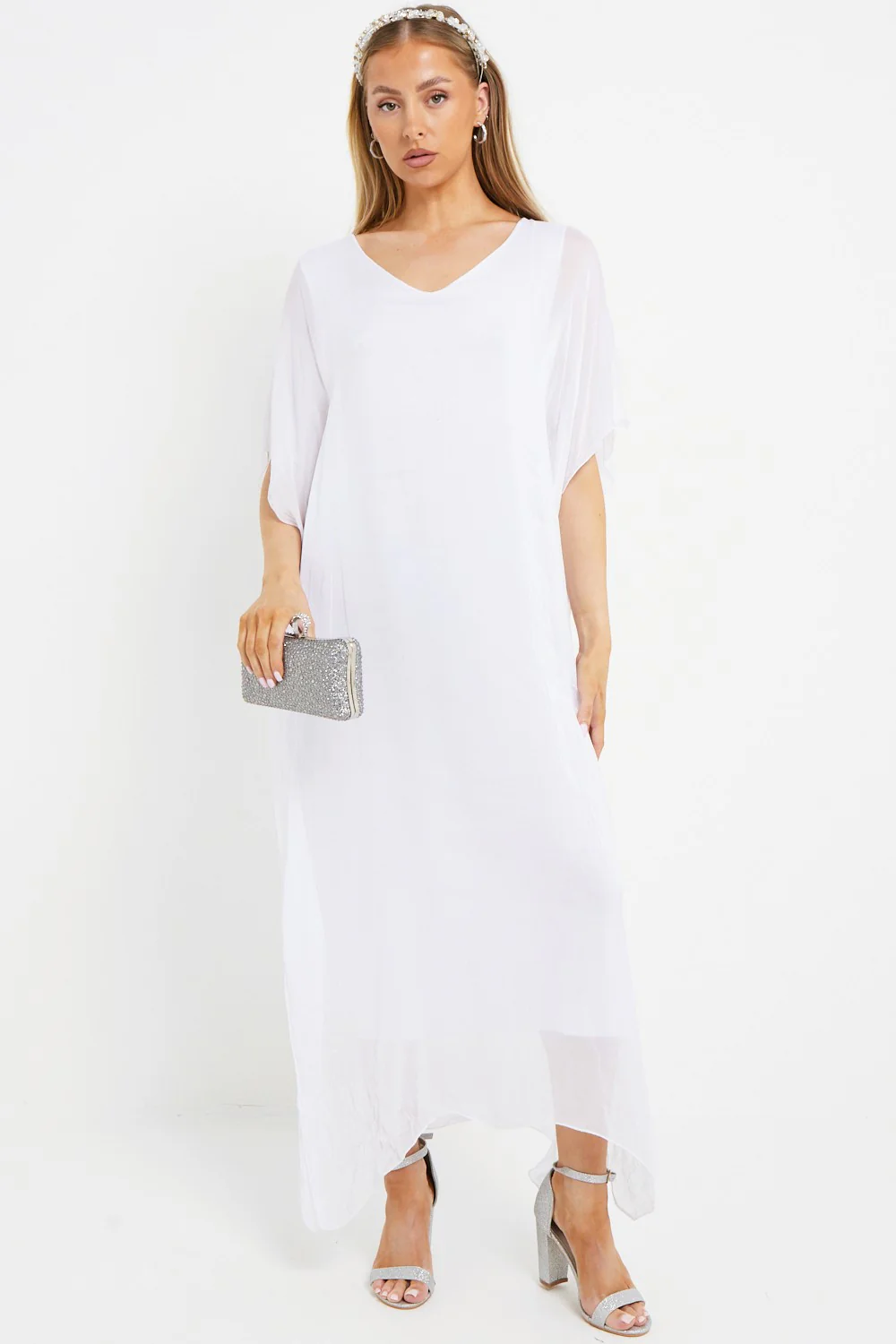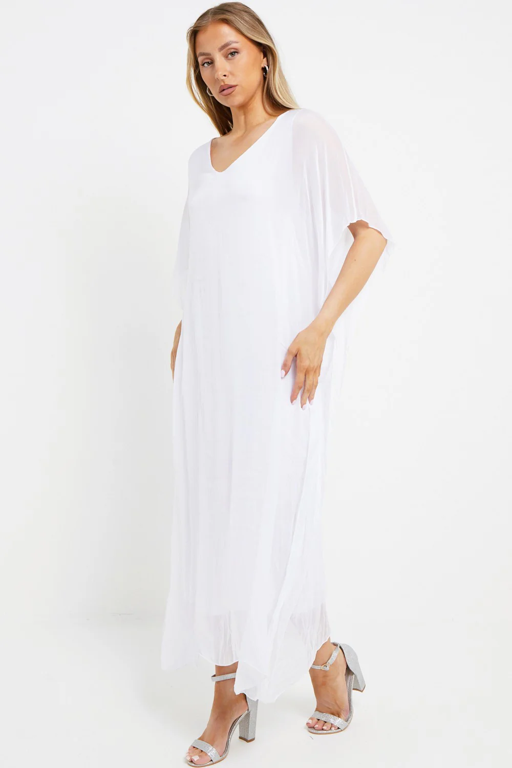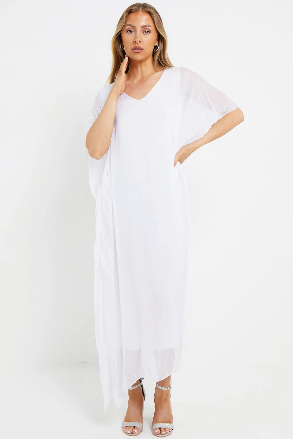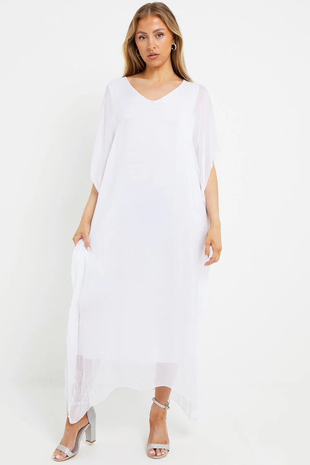 Crafted from lightweight, semi-sheer silk, this floaty White Maxi Kaftan Dress is designed for a relaxed fit. This style features a V-neckline, short sleeves and a soft viscose lining.